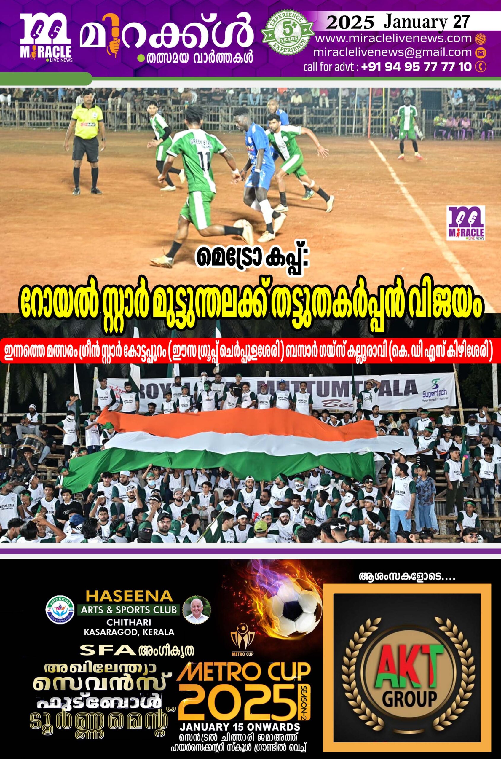 റോയല് സ്റ്റാര് മുട്ടുന്തലക്ക് (കെ.എം.ജി. മാവൂര് ) തട്ടുതകര്പ്പന് വിജയം. മറുപടിയില്ലാത്ത മൂന്ന് ഗോളുകള്ക്ക് അവര് ഗ്രീന് സ്റ്റാര് കളനാടിനെ (എഫ്.സി. കൊണ്ടോട്ടി ) തകര്ത്തു വിട്ടു.
