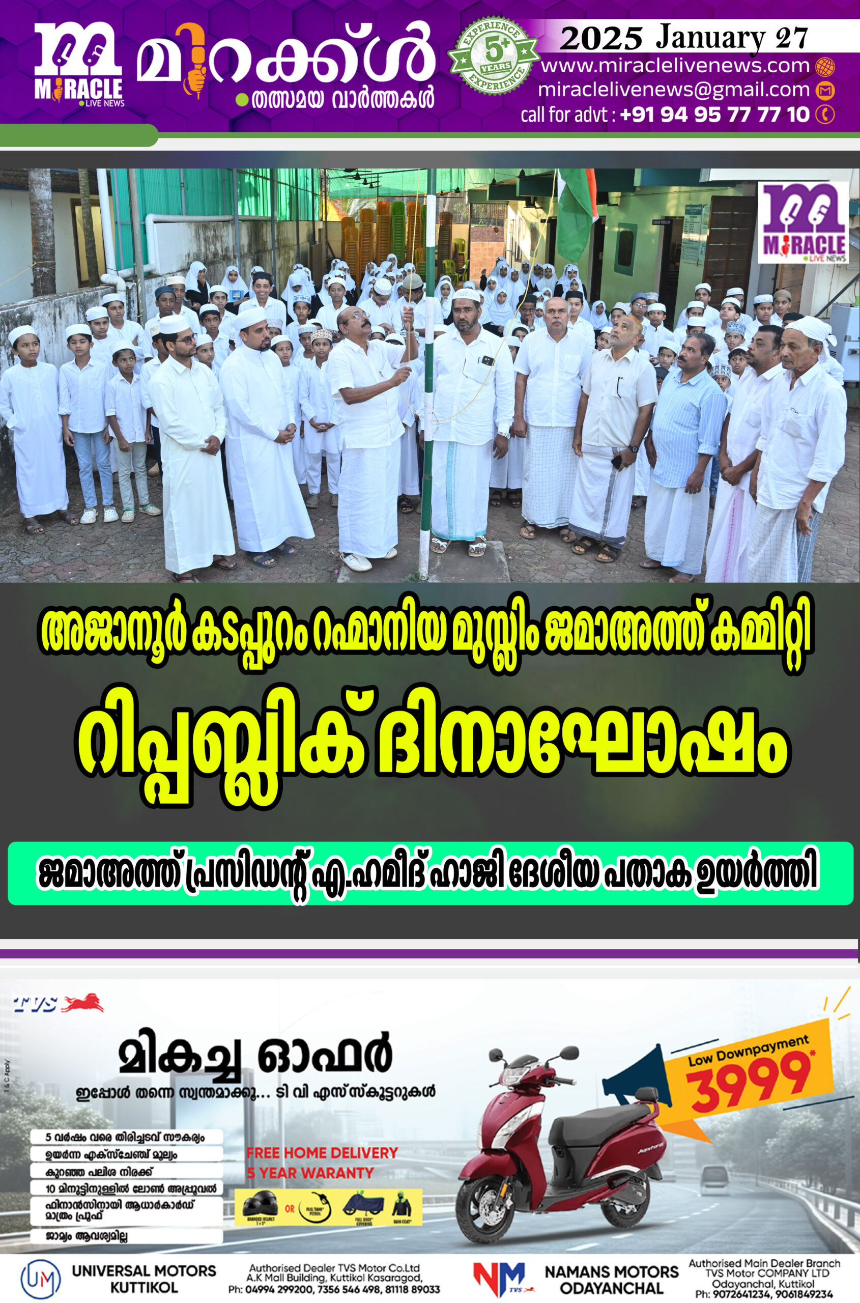അജാനൂര്‍ കടപ്പുറം റഹ്‌മാനിയ മുസ്ലിം ജമാഅത്ത് കമ്മിറ്റി റിപ്പബ്ലിക് ദിനാഘോഷം: ജമാഅത്ത് പ്രസിഡന്റ് എ.ഹമീദ് ഹാജി ദേശീയ പതായ ഉയര്‍ത്തി