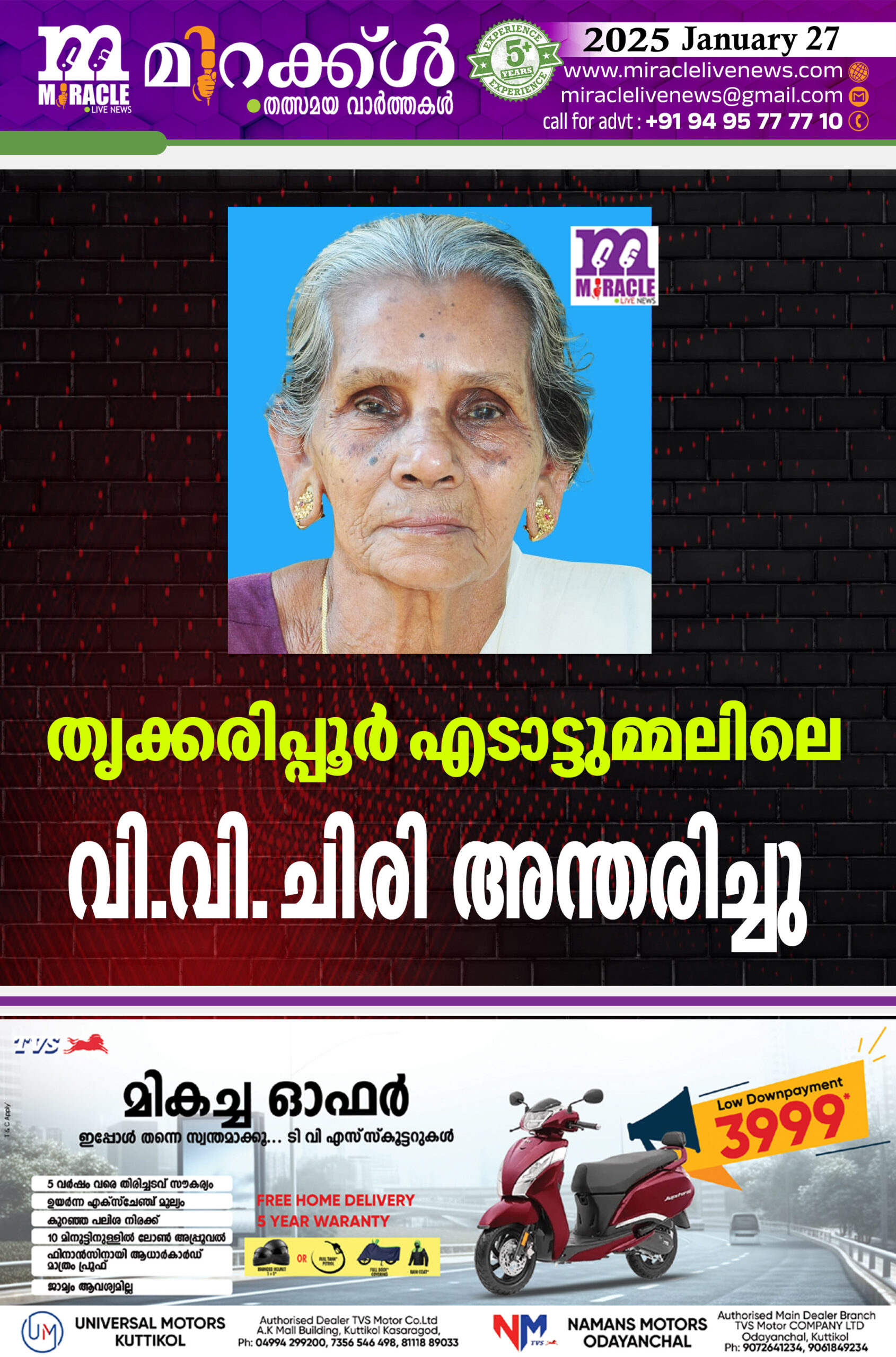 തൃക്കരിപ്പൂര്‍ : എടാട്ടുമ്മലിലെ വി.വി. ചിരി ( 92 ) അന്തരിച്ചു. ഭര്‍ത്താവ്: പരേതനായ പാലായി അമ്പു . മക്കള്‍: വി.വി. നാരായണി, വി.വി.ദേവകി, വി.വി. കാര്‍ത്യായനി, വി.വി.കൃഷ്ണന്‍ (ആര്‍ ജെ ഡി കാസര്‍കോട് ജില്ലാ പ്രസിഡന്റ് , റിട്ട. കേരളാ ബാങ്ക് മാനേജര്‍), വി.വി. വിലാസിനി, വി.വി. നാരായണന്‍( എസ്ബിഐ തൃക്കരിപ്പൂര്), വി.വി.വിജയന്‍ ( പ്രസിഡന്റ് തൃക്കരിപ്പൂര് ഫാര്‍മേഴ്‌സ് ബാങ്ക്), വി.വി. സുരേഷ്, വി.വി.സുജാത (കരിവെള്ളൂര്‍ പാലക്കുന്ന് ) പരേതയായ വി.വി.തമ്പായി. മരുമക്കള്‍ അമ്പാടി പുതിയ കണ്ടം,പരേതനായ രാഘവന്‍ കാറമേല്‍, ശൈലജ.പി.പി.വെള്ളച്ചാല്‍ (കെ.എസ്.ആര്‍.ടി.സി. കാസര്‍കോട് ), ഷീജ എ.എല്‍പി സ്‌കൂള്‍ തെക്കെക്കാട് , രാജി അച്ചാംതുരുത്തി (കൃഷിഭവന്‍രാമന്തളി ) ജ്യോതി കാര്യങ്കോട്, കണ്ണന്‍ പുളിങ്ങോം പി.പി. കുഞ്ഞിരാമന്‍ പാലക്കുന്ന് ,സി.പി.എം മുന്‍ പാലക്കുന്ന് ബ്രാഞ്ച് സെക്രട്ടറി) പരേതനായ കുഞ്ഞിരാമന്‍ മട്ടമ്മല്‍, സഹോദരങ്ങള്‍ പരേതരായ വി. വി. അമ്പു, വി.വി.കണ്ണന്‍ വി.വി.കുഞ്ഞിരാമന്‍, വി.വി. രാഘവന്‍, സംസ്‌കാരം നാളെ രാവിലെ 9 മണിക്ക് ഇളമ്പച്ചി സമുദായശ്മശാനത്തില്‍