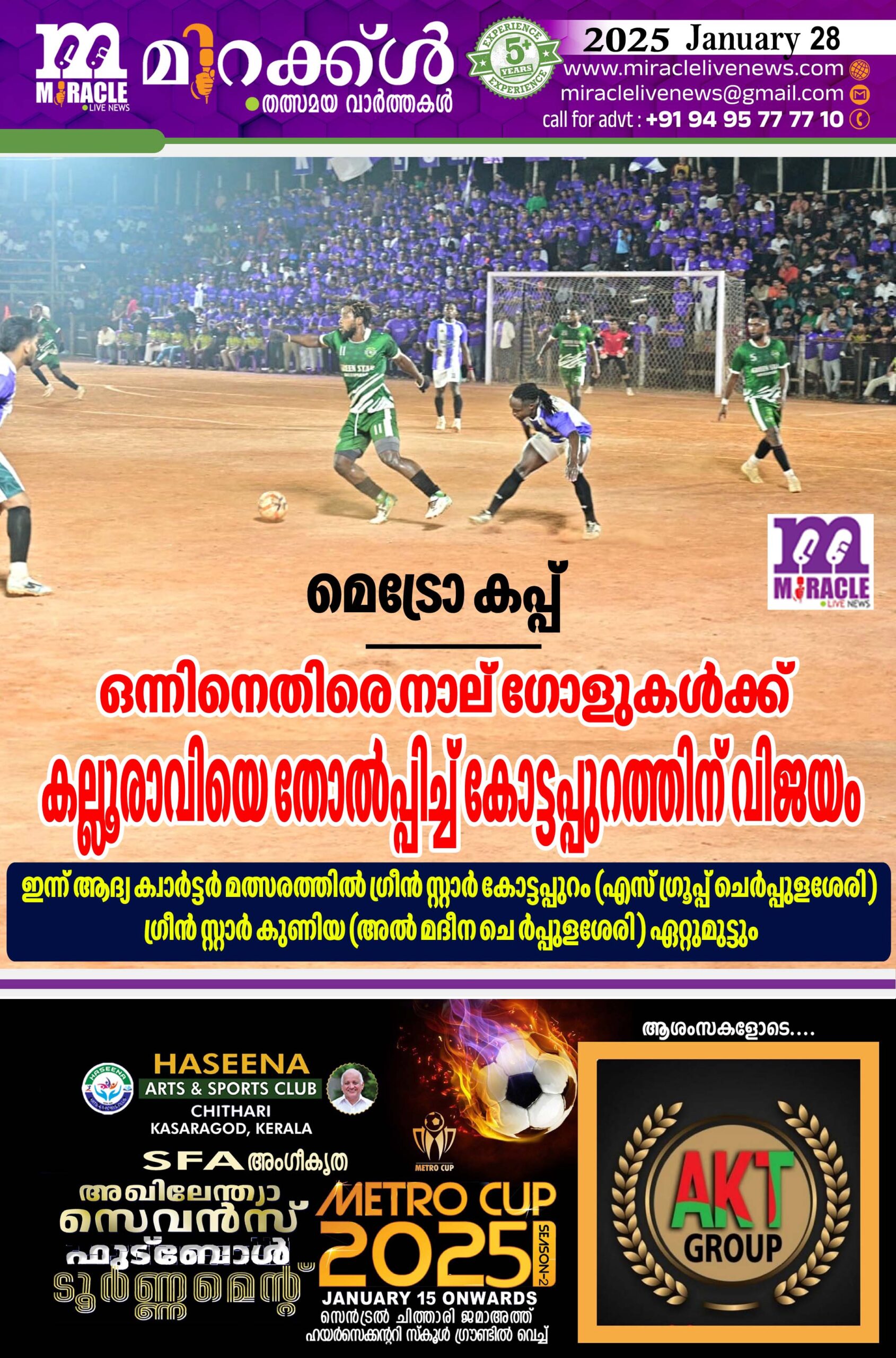 മെട്രോ കപ്പ്: ഒന്നിനെതിരെ നാല് ഗോളുകള്‍ക്ക് കല്ലൂരാവിയെ തോല്‍പ്പിച്ച് കോട്ടപ്പുറത്തിന് വിജയം; ഇന്ന് ആദ്യ ക്വാര്‍ട്ടര്‍ മത്സരത്തില്‍ ഗ്രീന്‍ സ്റ്റാര്‍ കോട്ടപ്പുറം (എസ് ഗ്രൂപ്പ് ചെര്‍പ്പുളശേരി ) ഗ്രീന്‍ സ്റ്റാര്‍ കുണിയ (അല്‍ മദീന ചെ ര്‍പ്പുളശേരി ) ഏറ്റുമുട്ടും