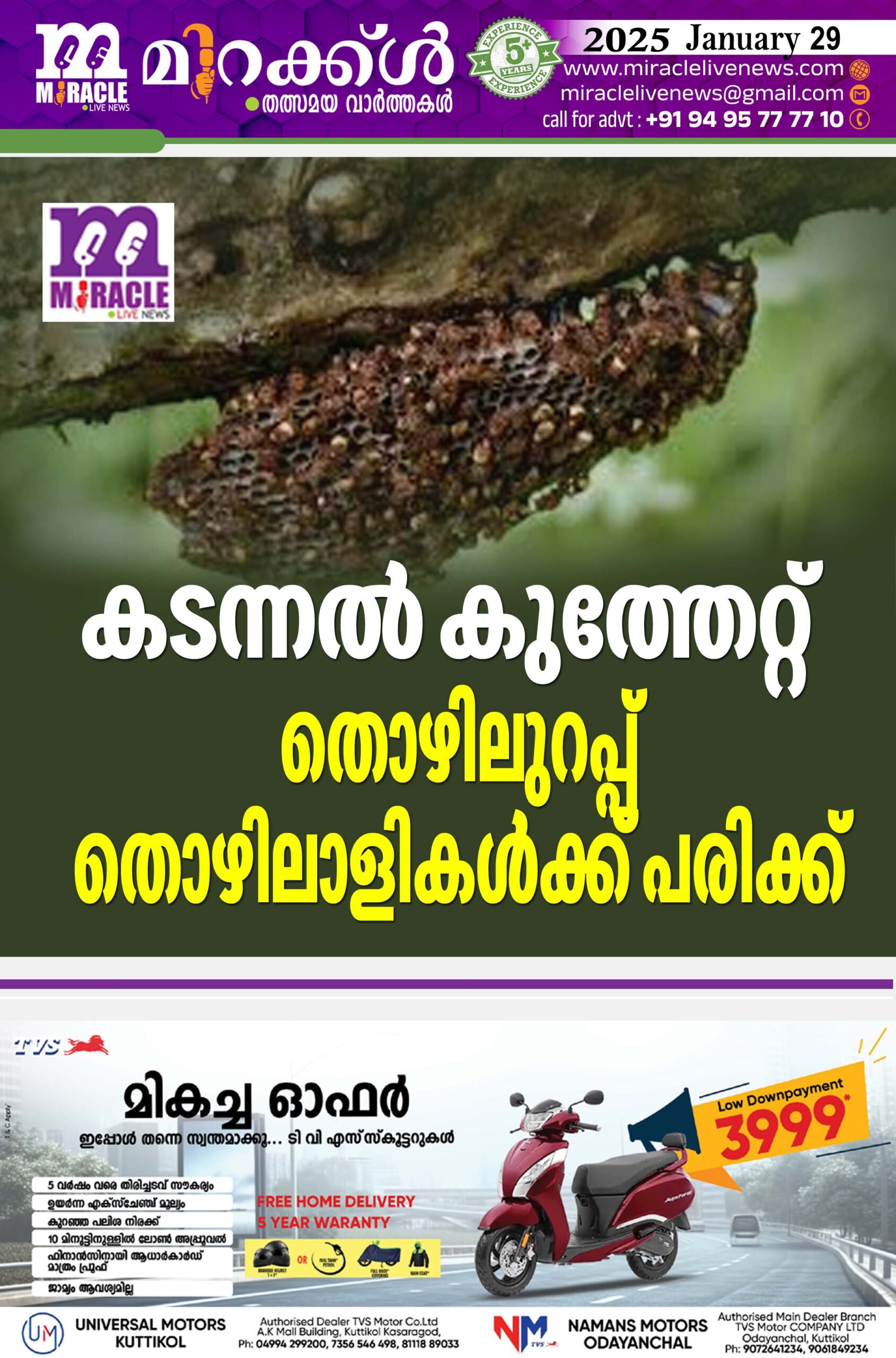 രാജപുരം : കള്ളാര് പൂക്കയം പുതിയകുടിയില് കടന്നല്ക്കുത്തേറ്റ് എട്ട് തൊഴിലുറപ്പ് തൊഴിലാളികള്ക്ക് പരിക്ക്. സാരമായി പരിക്കേറ്റ ആടകം പുതിയകുടിയിലെ സാവിത്രി(42)യെ ജില്ലാ ആശുപത്രിയില് പ്രവേശിപ്പിച്ചു. രജനി (45), സുനിത (30), ദേവകി (45), ഗീതാഭായി (55), പുഷ്പ (37) എന്നിവരെയാണ് പൂടംകല്ല് താലൂക്ക് ആശുപത്രിയില് പ്രവേശിപ്പിച്ചത്. ജലജ (33), കമലാക്ഷി ഭായി (66) എന്നിവരെ പ്രാഥമിക ചികിത്സ നല്കി വിട്ടയച്ചു. ചൊവ്വാഴ്ച ഒരുമണിയോടെ ആടകം പുതിയകുടിയില് സ്വകാര്യവ്യക്തിയുടെ കൃഷിയിടത്തില് ജോലി ചെയ്യുന്നതിനി ടെ കടന്നല്ക്കൂട്ടം കത്തുകയായിരുന്നു. സമീപത്തെ തെങ്ങിന്മു കളിലുണ്ടായിരുന്ന കടന്നല്ക്കൂട് പരുന്ത് ചവിട്ടി ഇളക്കിയതാണ് കരുതുന്നു.