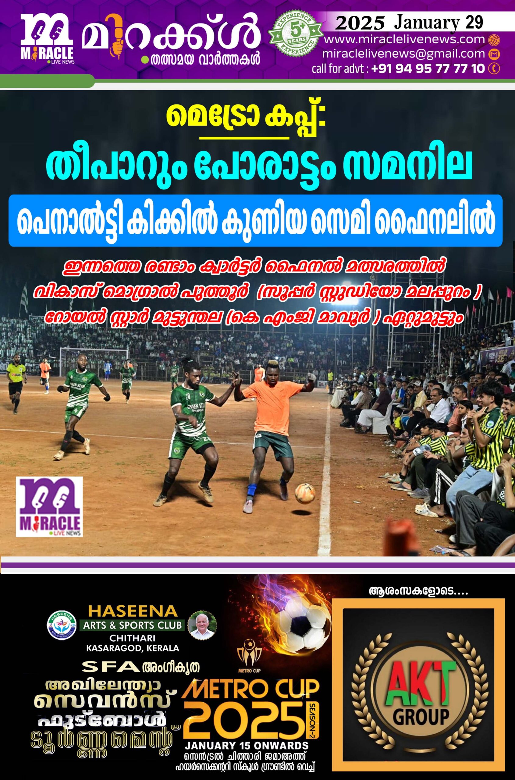 കാഞ്ഞങ്ങാട്: ചിത്താരി ഹസീന ക്ലബ്ബ് സംഘടിപ്പിക്കുന്ന രണ്ടാമത് എസ്.എഫ്.എ അംഗീകൃത മെട്രോ മുഹമ്മദ് ഹാജി അഖി ലേന്ത്യ സെവന്സ് ഫുട്ബോള് ഫ്ളഡ് ലൈറ്റ് ടൂര്ണ്ണമെന്റില് ഗ്രീന് സ്റ്റാര് കുണിയ (അല് മദീന ചെര്പ്പുളശേരി) ഗ്രീന് സ്റ്റാര് കോട്ടപ്പുറത്തിന്റെയും (എസ്സ ഗ്രൂപ്പ് ചെര്പ്പുളശേരി ) കളി അവസാനിക്കുവോളം ഗോള് രഹിത സമനിലയില് കലാശിച്ചു. മല്സരം സമനിലയില് കലാശിച്ചതോടെ പെനാല്ട്ടി ഷൂട്ടിലൂടെയാണ് കുണിയ വിജയിച്ചത്. ഇരുടീമുകള്ക്കും ഗോള് നേടാന് മികച്ച അവസരങ്ങള് ലഭിച്ചെങ്കിലും ഗോള് കീപ്പര്മാരുടെ മികവുകൊണ്ട് രക്ഷപ്പെടുകയായിരുന്നു.