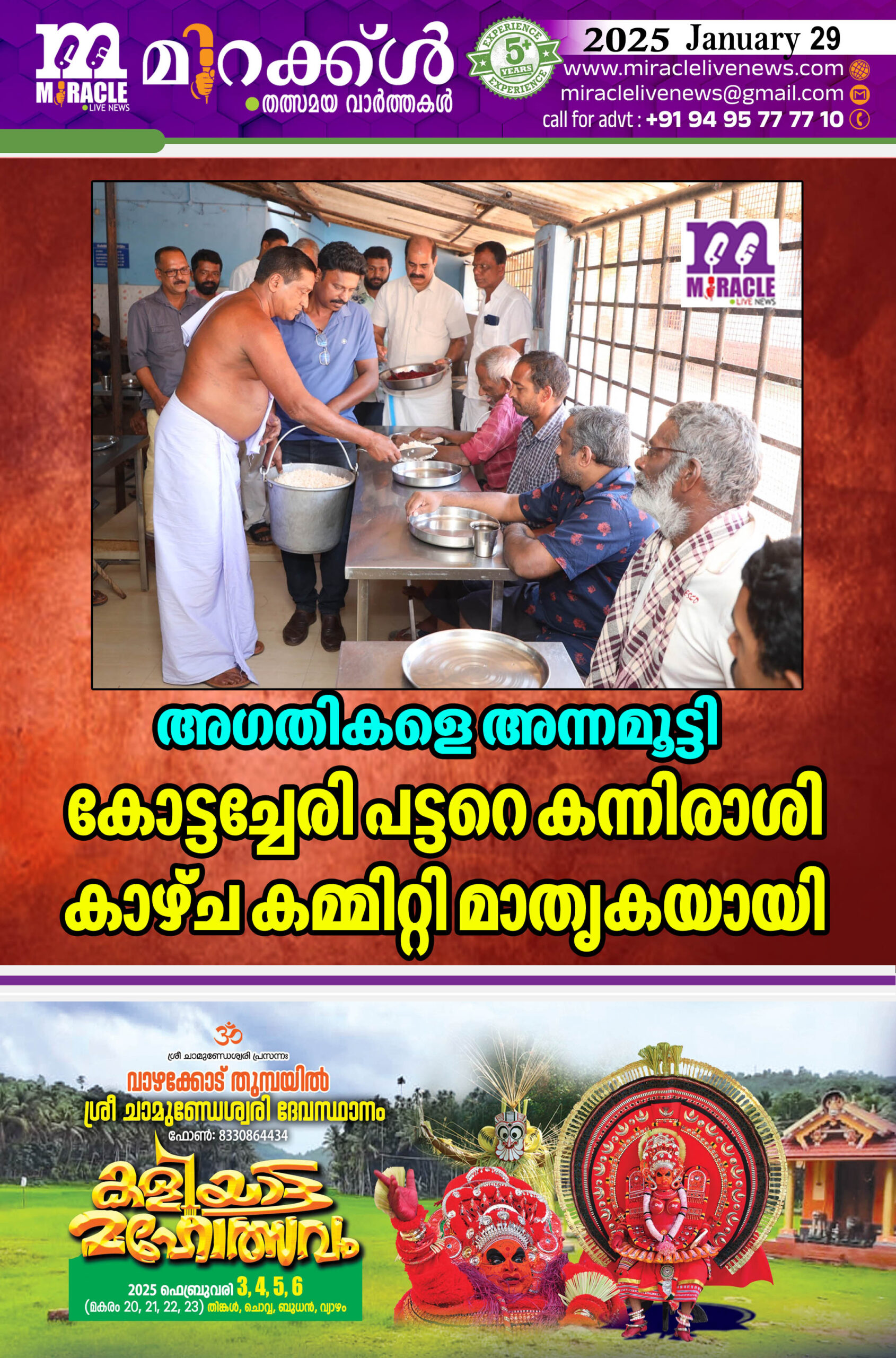 കാഞ്ഞങ്ങാട്: ജനവരി 30 മുതല് ഫെബ്രുവരി മൂന്നുവരെ നടക്കു ന്ന കിഴക്കുംകര പുള്ളിക്കരിങ്കാളി അമ്മ ദേവസ്ഥാനം കളിയാട്ട മഹോത്സവത്തില് കാഴ്ച സമര്പ്പിക്കുന്ന കോട്ടച്ചേരി പട്ടറെ ക ന്നിരാശി കാഴ്ച കമ്മിറ്റി അഗതികളെ അന്നമൂട്ടി തങ്ങളുടെ സാ മുഹ്യ പ്രതിബദ്ധത തെളിയിച്ചു.