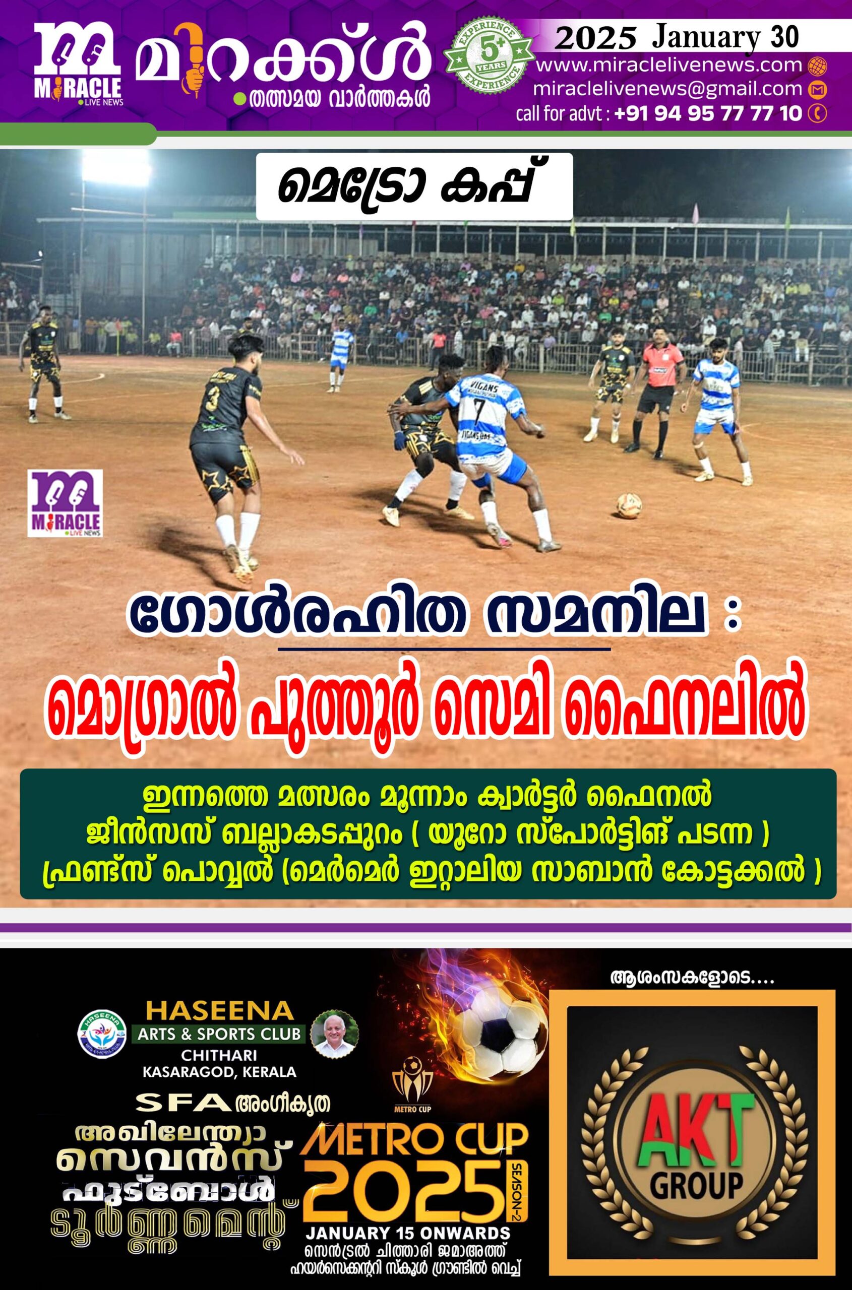 കാഞ്ഞങ്ങാട്: ചിത്താരി ഹസീന ക്ലബ്ബ് സംഘടിപ്പിക്കുന്ന രണ്ടാമത് എസ്.എഫ്.എ അംഗീകൃത മെട്രോ മുഹമ്മദ് ഹാജി അഖി ലേന്ത്യ സെവന്സ് ഫുട്ബോള് ഫ്ളഡ് ലൈറ്റ് ടൂര്ണ്ണമെന്റില് വിഗാന്സ് മൊഗ്രാല് പുത്തൂര് (സൂപ്പര് സ്റ്റുഡിയോ മലപ്പുറം ) റോയല് സ്റ്റാര് മുട്ടുന്തല (കെ എംജി മാവൂര് ) തമ്മിലുള്ള മത്സരം അവസരങ്ങള് നഷ്ടപ്പെടുത്തുന്നതില് ഇരു ടീമും മത്സരിച്ച പോരാട്ടമായിരുന്നു. ഗോള്രഹിത സമനിലയിലാണ് കലാശിച്ചത് . തുടര്ന്ന് പെനാല്റ്റിയിലൂടെ മൊഗ്രാല് പുത്തൂര് സെമി ഫൈനലില് കടന്നു. ഇരു ടീമികളും നിരവധി മികച്ച ഗോളവസരങ്ങള് തുറന്നെങ്കിലും നിര്ഭാഗ്യം വിലങ്ങുതടിയാവുകയായിരുന്നു. ഒന്നാം പകുതിയുടെ തുടക്കത്തില് തന്നെ ഇരു ടീമിനും കാര്യമായ മുന്നേറ്റങ്ങളൊന്നും സാധ്യമായില്ല.