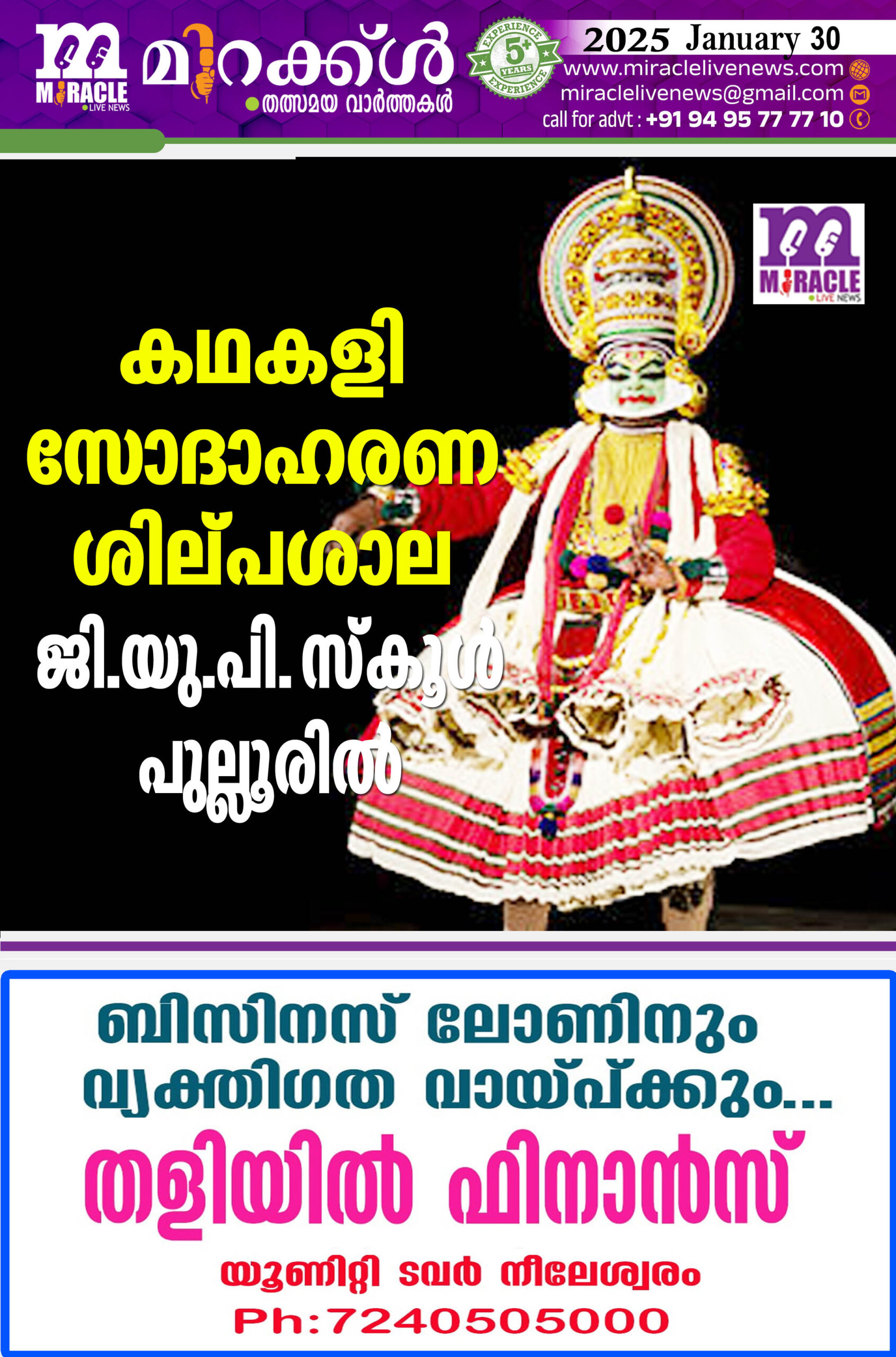 കാഞ്ഞങ്ങാട്: പുല്ലൂര്‍ ഗവണ്‍മെന്റ് യു.പി. സ്‌കൂള്‍ ശതാബ്ദി ആഘോഷത്തിന്റെ ഭാഗമായി ജനുവരി 31 വെള്ളിയാഴ്ച സ്‌കൂളില്‍ കഥകളി സോദാഹരണ പരിപാടി നടക്കും. കേരള സംഗീത നാടക അക്കാദമി ഗുരുപൂജ പുരസ്‌കാരം, കേരള കലാമണ്ഡലം കഥകളി വേഷത്തിനുള്ള സംസ്ഥാന പുരസ്‌കാരം എന്നിവ നേടിയ പ്രമുഖ കഥകളി ആശാനും പുല്ലൂര്‍ ഗവണ്‍മെന്റ് യു.പി. സ്‌കൂളിലെ പൂര്‍വ്വ വിദ്യാര്‍ത്ഥിയുമായ നാട്യകേസരി കേശവ കുണ്ട്‌ലായര്‍ ശില്പശാലയില്‍ സോദാഹരണക്ലാസ്സ് നടത്തും. രാവിലെ മണി മുതല്‍ ഉച്ചവരെയാണ് പരിപാടി. കഥകളിയില്‍ താല്‍പര്യമുള്ള കലാസ്‌നേഹികള്‍ക്കും സോദാഹരണ ക്ലാസ്സില്‍ പങ്കെടുക്കാന്‍ അവസരം ഉണ്ടാവും.