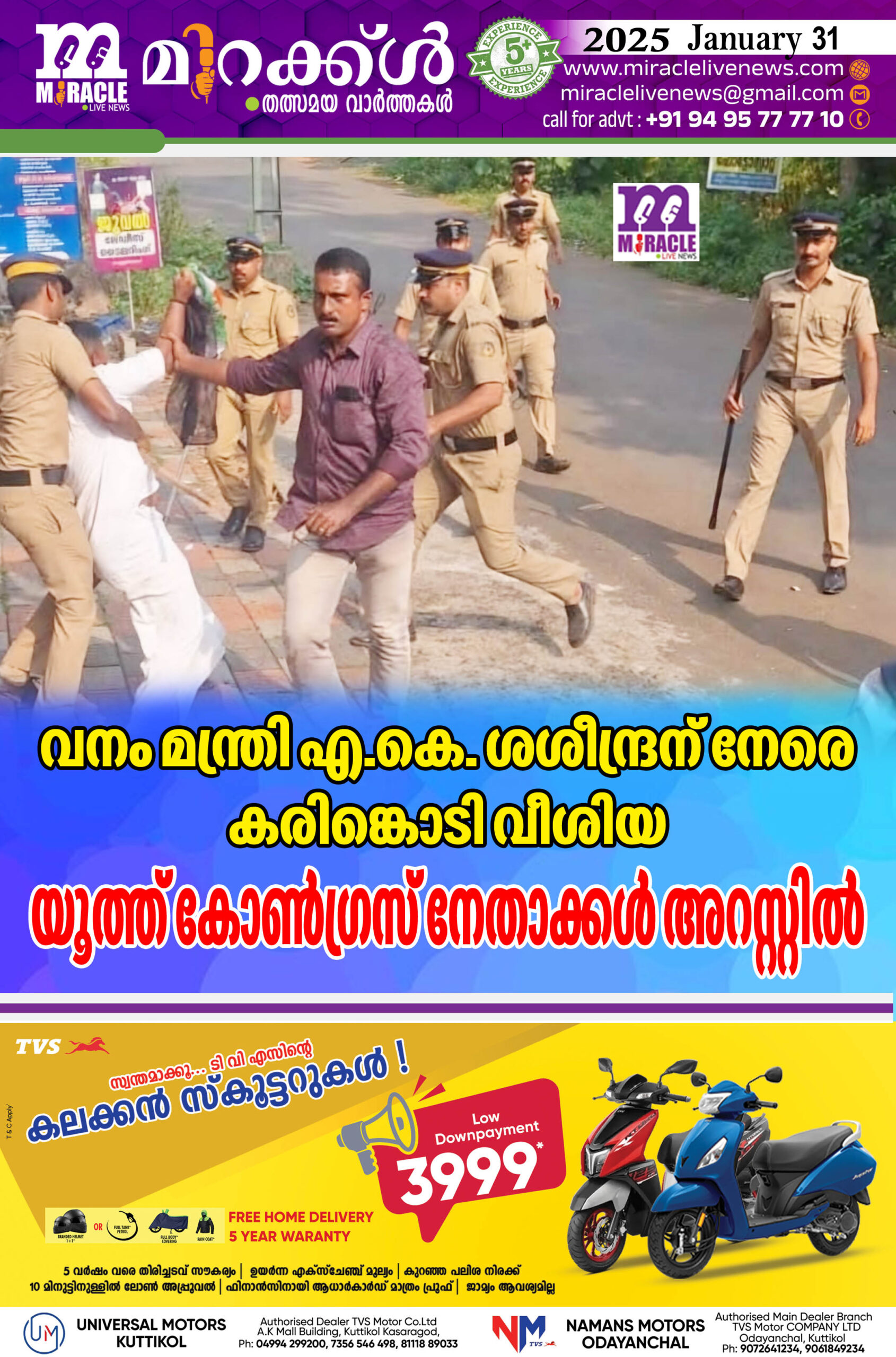 വനം മന്ത്രി എ.കെ. ശശീന്ദ്രന് നേരെ കരിങ്കൊടി വീശിയ യൂത്ത് കോണ്ഗ്രസ് നേതാക്കള് അറസ്റ്റില്