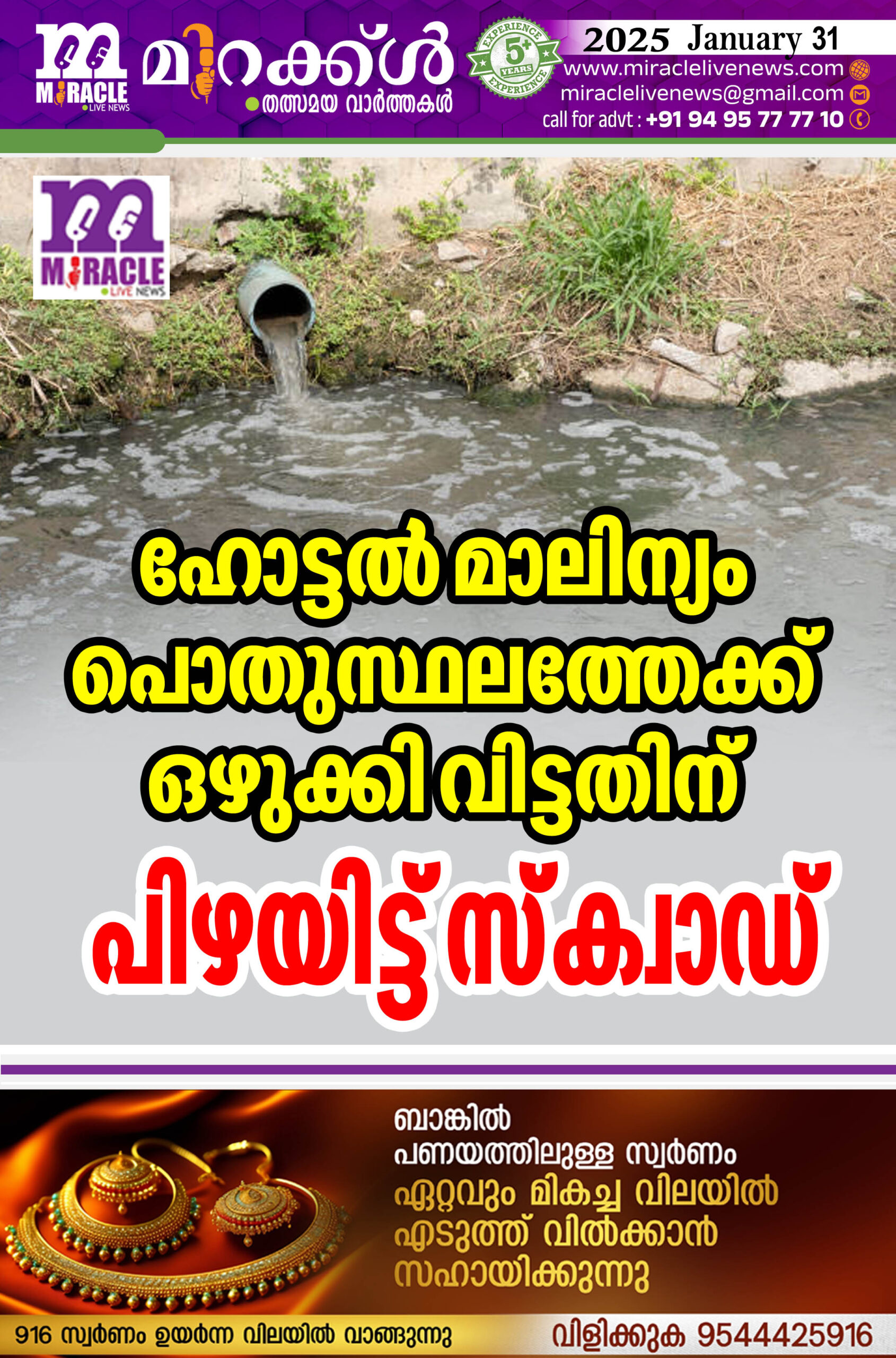 കാസറഗോഡ് : തൃക്കരിപ്പൂര് ബസ് സ്റ്റാന്റിനു അഭിമുഖമായുള്ള ഹോട്ടലില് നിന്നുള്ള ഉപയോഗ ജലം പൊതുവഴിയിലേക്കും തൊട്ടടുത്തുള്ള പറമ്പിലേക്കും ഒഴുക്കി വിട്ടതിന് തദ്ദേശ സ്വയംഭരണ വകുപ്പിന്റെ ജില്ലാ എന്ഫോഴ്സ്മെന്റ് സ്ക്വാഡ് ഹോട്ടല് ഉടമക്ക് 10000 രൂപ പിഴ ചുമത്തി . സോക് പിറ്റ് ശാസ്ത്രീയമായി നിര്മ്മിക്കുന്നതിനും പുറത്തേക്കുള്ള പൈപ്പ് കണക്ഷന് വിച്ഛേദിക്കുന്നതിനും നിര്ദ്ദേശം നല്കി. നിശ്ചിത ദിവസത്തിനകം മലിനജല സംസ്കരണത്തിന് സംവിധാനം ഒരുക്കിയില്ലെങ്കില് സ്റ്റോപ് മെമ്മോ നല്കുന്നതടക്കമുള്ള നടപടികള് സ്വീകരിക്കാന് പഞ്ചായത്തിന് നിര്ദ്ദേശം നല്കി.