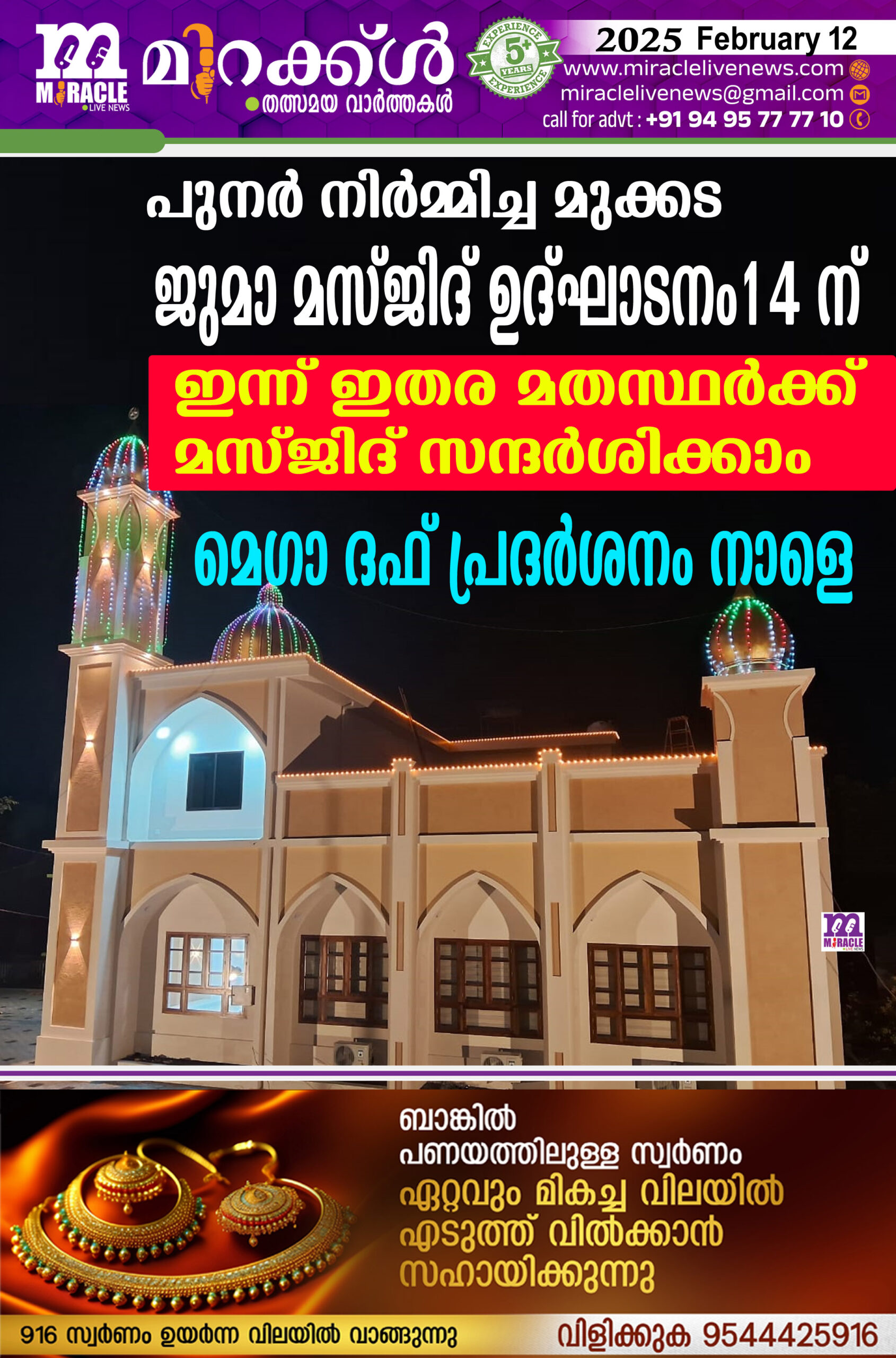 പുനര്‍ നിര്‍മ്മിച്ച മുക്കട ജുമാ മസ്ജിദ് ഉദ്ഘാടനം 14 ന്; ഇന്ന് ഇതര മതസ്ഥര്‍ക്ക് മസ്ജിദ് സന്ദര്‍ശിക്കാം; മെഗാ ദഫ് പ്രദര്‍ശനം നാളെ