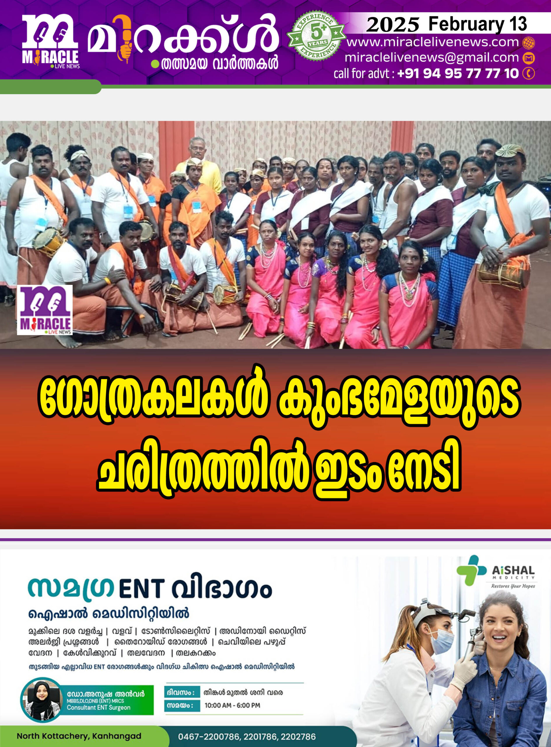 ഉത്തര്പ്രദേശ് : 144 വര്ഷങ്ങള്ക്ക് ശേഷം ഉത്തര്പ്രദേശിലെ പ്രയാഗ് രാജില് നടന്നു കൊണ്ടിരിക്കുന്ന മഹാകുംഭ മേളയില് ഗോത്രകലകള് അരങ്ങേറി.കാസര്ഗോഡ് ജില്ലയിലെ മൂന്നാം മൈല് മുണ്ടോട്ട് ഊരിലെ മാവിലന് സമുദായത്തിന്റെ മംഗലം കളി, കണ്ണൂര് ജില്ലയിലെ പാനൂര് നരിക്കോട്ട്മലയിലെ കുറിച്യ സമുദായത്തിന്റെ കോല്ക്കളി, ഇടുക്കി ജില്ലയിലെ മറയൂരിലെ കുമിട്ടാന് കുഴി ഊരിലെ ഹില്പ്പുലയ സമുദായത്തിന്റെ മലപ്പുലയാട്ടം, എന്നീ ഗോത്രകലകള് ആണ് കുംഭമേളയില് പ്രദര്ശിപ്പിച്ചത്. 1952 മുതല് പൂര്ണമായും വനവാസി മേഖലയില് പ്രവര്ത്തിക്കുന്ന അഖില ഭാരതീയ വനവാസി കല്യാണാശ്രമം ആണ് ഇത്തരത്തില് ഒരു പരിപാടി സംഘടിപ്പിക്കുവാന് നേതൃത്വം വഹിച്ചത്. രണ്ട് ദിവസങ്ങളിലായി 150 ഓളം ഗോത്രകലകള് ആണ് പ്രദര്ശിപ്പിച്ചത്.