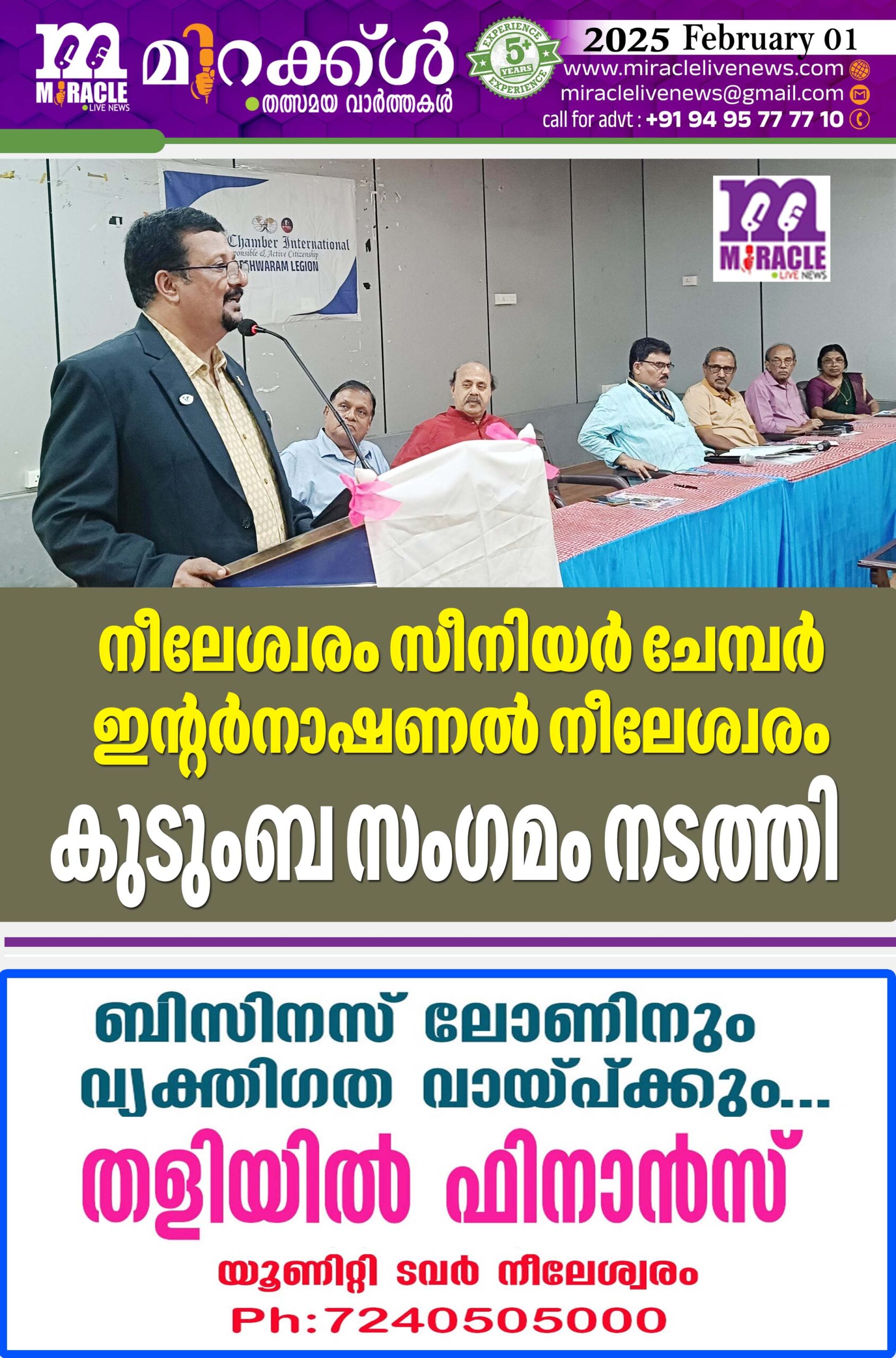 നീലേശ്വരം :സീനിയര് ചേമ്പര് ഇന്റര്നാഷണല് നീലേശ്വരം കുടുംബ സംഗമം നടത്തി. ദേശീയ സെക്രട്ടറി ജനറല് രാജേഷ് വൈഭവ് ഉദ്ഘാടനം ചെയ്തു. സീനിയര് ചേമ്പര് ഇന്റര്നാഷണല് നീലേശ്വരം ലീജിയന് കുടുംബ സംഗമം പടന്നക്കാട് ബേക്കല് ക്ലബ്ബില് വെച്ച് നടത്തി. സീനിയര് ചേമ്പര് ഇന്റര്നാഷണല് സെക്രട്ടറി ജനറല് രാജേഷ് വൈഭവ് മുഖ്യാതിഥിയായിരുന്നു. പ്രസിഡന്റ് എം. നാരായണന് നായര് അദ്ധ്യക്ഷത വഹിച്ചു. മുന് ദേശീയ പ്രസിഡന്റ് ഡോ: എ. മുരളീധരന് പുതുതായി അംഗത്വമെടുത്തവര്ക്ക് സത്യവാചകം ചൊല്ലിക്കൊടുത്തു. വനിതാ വിഭാഗം അദ്ധ്യക്ഷ ഡോ: സുലേഖ രാമൂഷ്ണന്, മുന് പ്രസിഡന്റ് കെ. രാമകൃഷ്ണന്, കെ.വി സുനില് രാജ്, കെ. ഗിരീഷ് കുമാര്, സെക്രട്ടറി അഡ്വ. സി. ഈപ്പന്, ട്രഷറര് രാജ് മോഹന് കരിങ്ങാട്ട് എന്നിവര്പ്രസംഗിച്ചു.