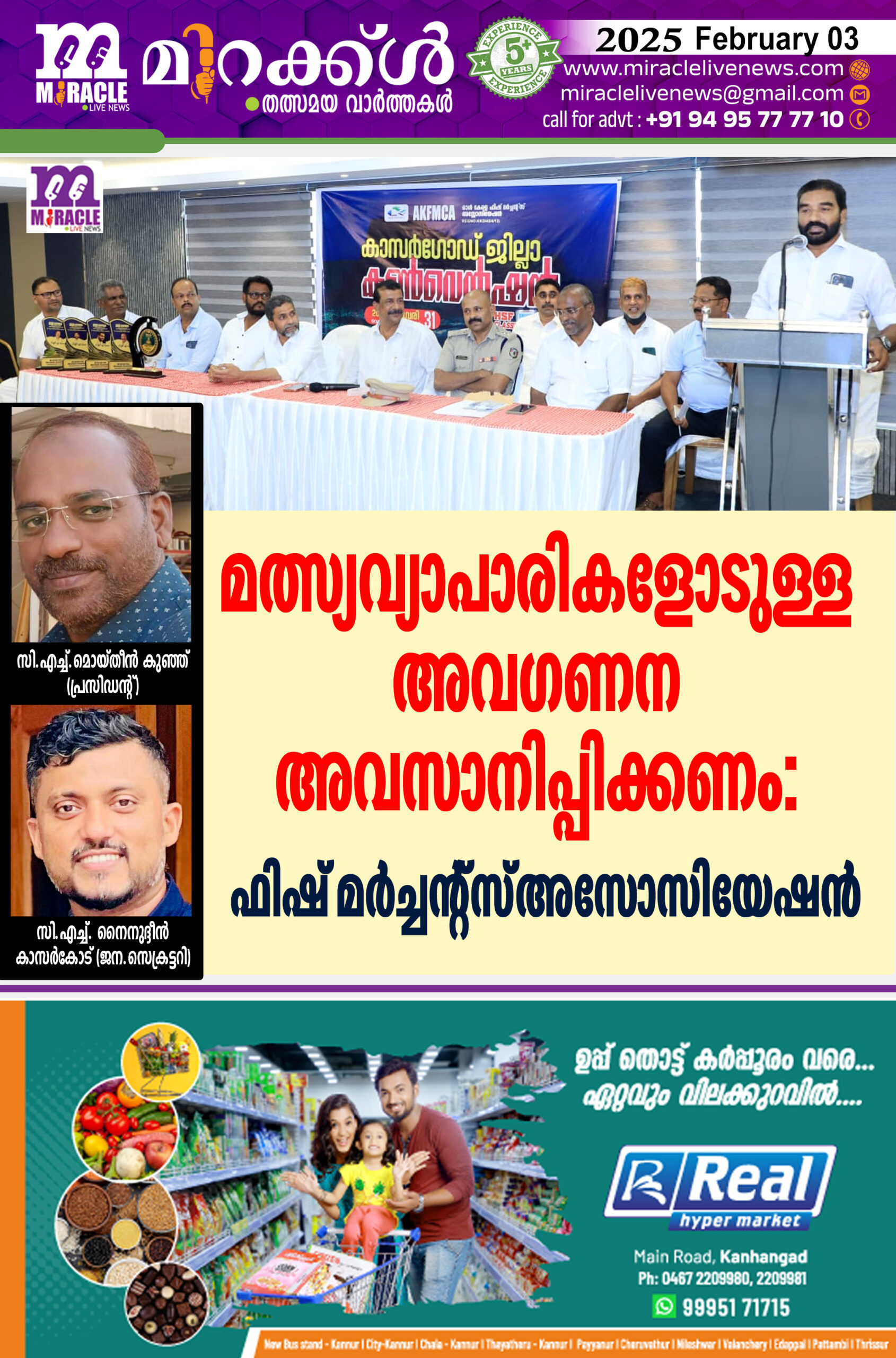 കാഞ്ഞങ്ങാട് : സംസ്ഥാനത്തെ ഹാര്‍ബര്‍, ഫിഷ് മാര്‍ക്കറ്റ് മാനേ ജ്‌മെന്റ് സൊസൈറ്റികളില്‍ മത്സ്യ വ്യാപാര പ്രതിനിധികള്‍ക്ക് പ്രാതിനിധ്യം നല്‍കണമെന്നും സര്‍ക്കാര്‍ മത്സ്യവ്യാപാരികളോടു കാണിക്കുന്ന അവഗണന അവ സാനിപ്പിക്കണമെന്നും കേരള ഫി ഷ് മര്‍ച്ചന്റ്‌സ് അസോസിയേഷന്‍ ജില്ലാ കണ്‍വന്‍ഷന്‍. സംസ്ഥാന ജനറല്‍ സെക്രട്ടറി വി.വി.അനില്‍ ഉദ്ഘാടനം ചെയ്തു. ജില്ലാ പ്രസിഡന്റ് മൊ യ്തീന്‍ കുഞ്ഞ് അധ്യക്ഷത വഹിച്ചു. കാഞ്ഞങ്ങാട് ഡിവൈ എസ്പി ബാബു പെരിങ്ങേത്ത് മുഖ്യാതിഥിയായി.