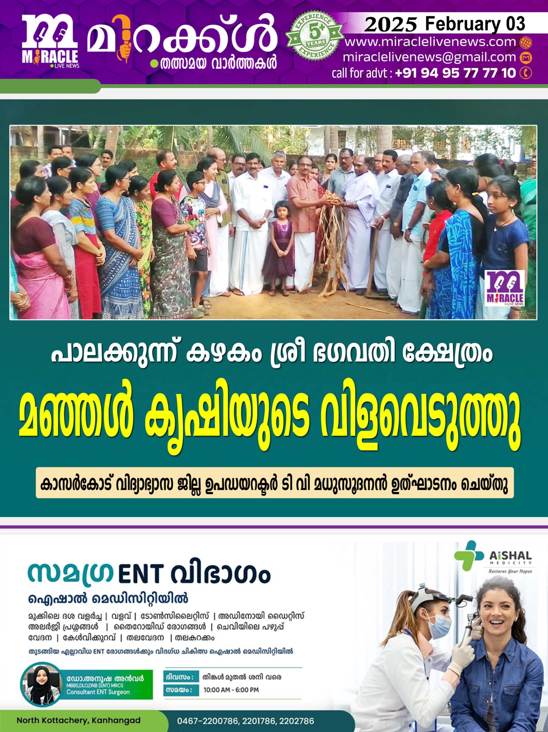പാലക്കുന്ന് കഴകം ശ്രീ ഭഗവതി ക്ഷേത്രം മഞ്ഞള് കൃഷിയുടെ വിളവെടുത്തു; കാസര്കോട് വിദ്യാഭ്യാസ ജില്ല ഉപഡയറക്ടര് ടി വി മധുസൂദനന് ഉത്ഘാടനം ചെയ്തു