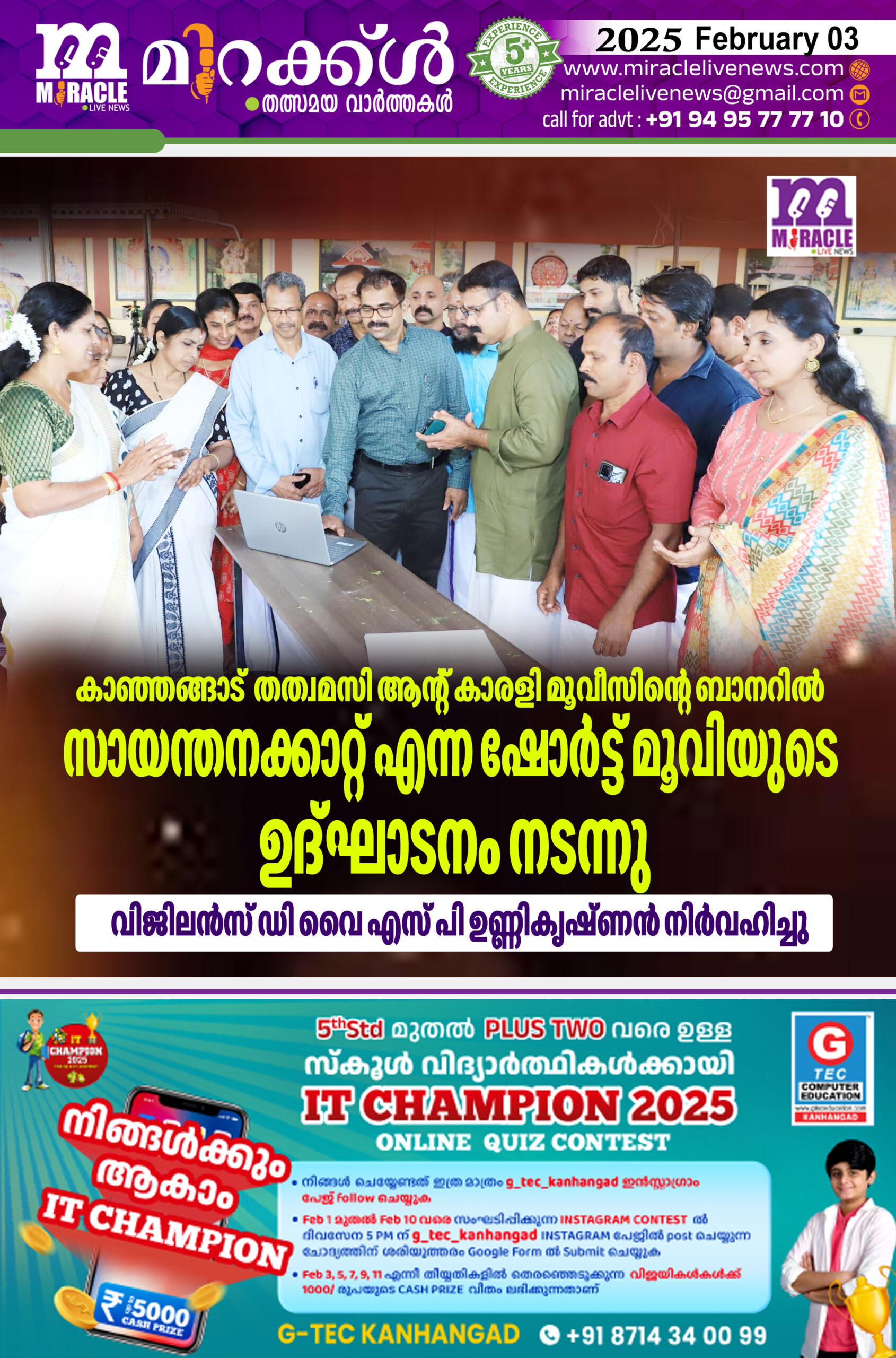 കാഞ്ഞങ്ങാട്: തത്വമസി & കാരളി മൂവീസിന്റെ ബാനറില് സായന്തന ക്കാറ്റ് എന്ന ഷോര്ട്ട് മൂവിയുടെ ഉദ്ഘാടനവും എ. രാമകൃഷ്ണന് പൊള്ളക്കട രചിച്ച ഗുരുവായൂര് കണ്ണന് എന്ന ആല്ബത്തിന്റെ തുടക്കവും കോട്ടച്ചേരി വിഷ്ണു മൂര്ത്തി ക്ഷേത്രത്തില് വച്ചു നടന്നു. പ്രസിഡന്റ് ഗീത അശോകിന്റെ അധ്യക്ഷതയില് സ്വിച്ച് ഓണ് കര്മ്മം വിജിലന്സ് ഡി വൈ എസ് പി ഉണ്ണികൃഷ്ണന്, നിര്വഹിച്ചു. വീഡീയോ പ്രകാശനം ജില്ലാ ക്രൈയിം ബ്രാഞ്ച് ഡി വൈ എസ് പി ഉത്തംദാസ് രാമകൃഷ്ണന് പൊള്ളക്കടയ്ക്ക് കൈമാറി. യോഗത്തില് സെക്രട്ടറി ദേവദാസ് കെ വി,ചന്ദ്രന് കാരളി, എം എസ് നമ്പൂതിരി, മാജിക് അച്ചുകരിവെള്ളൂര്, വത്സരാജ് കാട്ടുകുളങ്ങര എന്നിവര് സംസാരിച്ചു. സായന്തന കാറ്റ് സംവിധായകന് – ചന്ദ്രന് കാരളി, ക്യാമറ – നിഷാന്ത്തലയടുക്കം