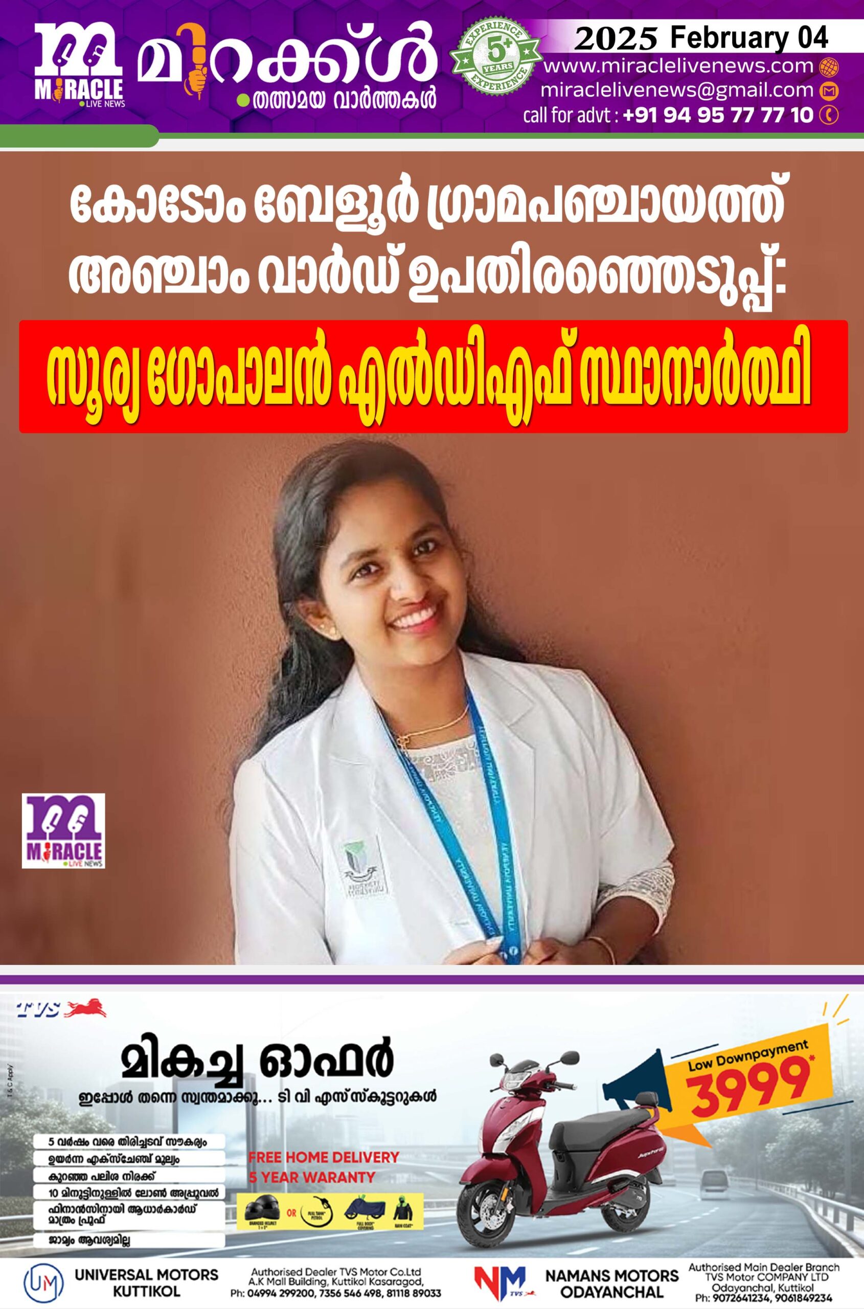 കോടോം ബേളൂര് ഗ്രാമപഞ്ചായത്ത് അഞ്ചാം വാര്ഡ് ഉപതിരഞ്ഞെടുപ്പ്: സൂര്യ ഗോപാലന് എല്ഡിഎഫ് സ്ഥാനാര്ത്ഥി
