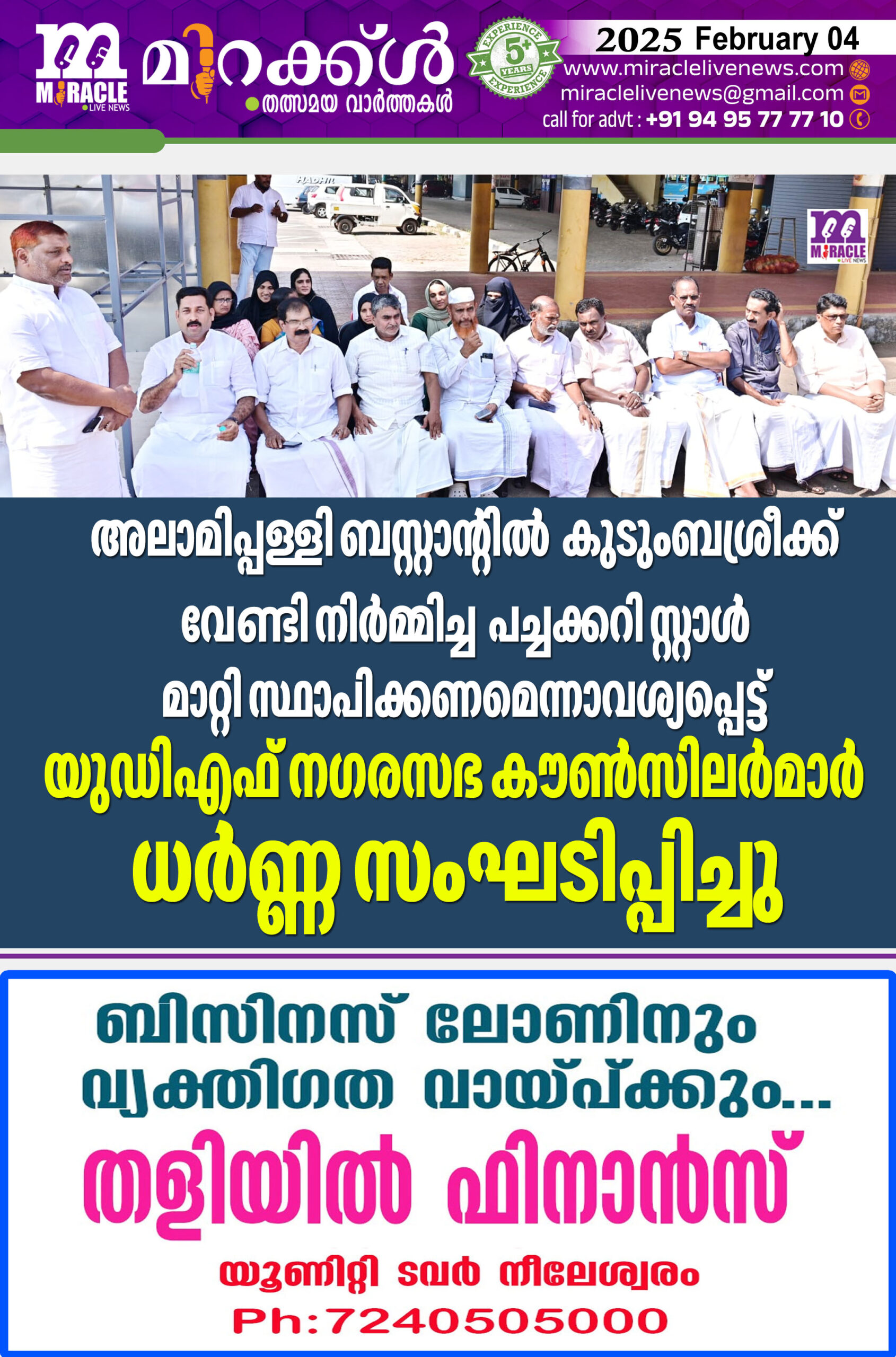 കാഞ്ഞങ്ങാട് : നഗരസഭയുടെ അലാമിപ്പള്ളി ബസ്സ്റ്റാന്റില് കുടുംബശ്രീക്ക് വേണ്ടി നിര്മ്മിച്ച പച്ചക്കറി സ്റ്റാള് മാറ്റി സ്ഥാപിക്കണമെന്നാവശ്യപ്പെട്ട് യുഡിഎഫ് നഗരസഭ കൗണ്സിലര്മാര് ധര്ണ്ണ സംഘടിപ്പിച്ചു. ബസ്സ്റ്റാന്റിന്റെ കാവടത്തില് തന്നെ സ്റ്റാള് നിര്മ്മിച്ചതിലൂടെ നഗരസഭയുടെ ബുദ്ധി ശൂന്യതയാണ് വെളിവാക്കുന്നത്. കോടികള് മുടക്കി നിര്മ്മിച്ച ബസ് സ്റ്റാന്റ് പൂര്ണ്ണമായും പ്രവര്ത്തന സജ്ജാക്കാന് നഗരസഭയ്ക്ക് ഇതുവരെ കഴിഞ്ഞിട്ടില്ല. കട മുറികള് ലേലം കൊണ്ടവരൊക്കെ പണം തിരിച്ചു ചോദിക്കുന്ന അവസ്ഥയില് എത്തിനില്ക്കുന്നു ഇത് ഭരണത്തിന്റെ പരാജയമാണ് വ്യക്തമാക്കുന്നത്.