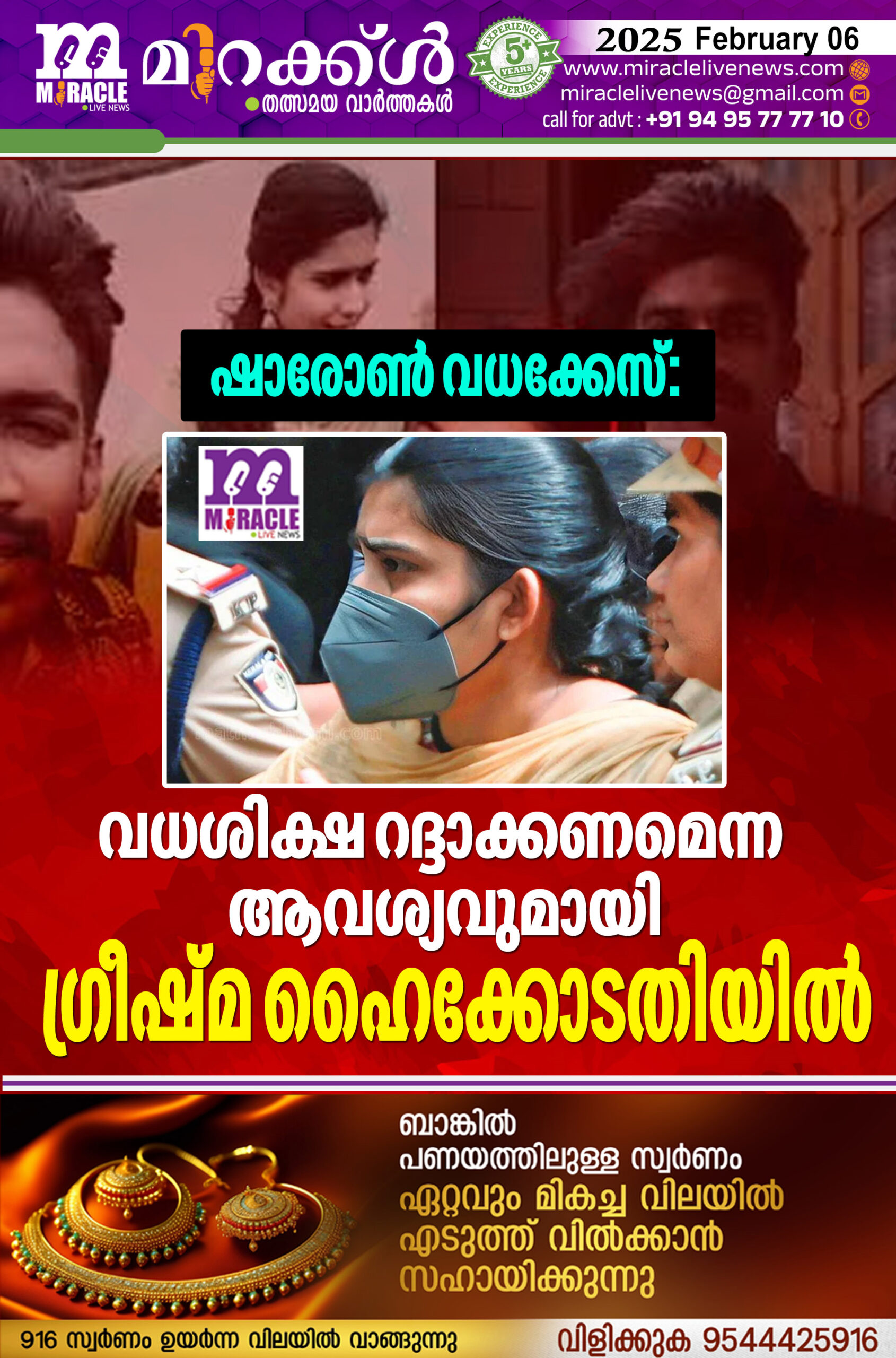കൊച്ചി: ഷാരോണ് വധക്കേസില് പ്രതിയായ ഗ്രീഷ്മയ്ക്ക് നെയ്യാറ്റിന്കര അഡീഷണല് സെഷന്സ് കോടതി വിധിച്ച വധശിക്ഷ റാദ്ദാക്കണമെന്ന ആവശ്യവുമായി ഗ്രീഷ്മ ഹൈക്കോടതിയില്. വധശിക്ഷ റദ്ദാക്കണമെന്ന ഹര്ജി ഹൈക്കോടതി ഇന്ന് പരിഗണിക്കും. വിചാരണയ്ക്ക് ശേഷം അഡീഷണല് സെഷന്സ് കോടതി പുറപ്പെടുവിച്ച വധശിക്ഷ റദ്ദാക്കണമെന്നാണ് ഹര്ജിയിലെ ആവശ്യം.