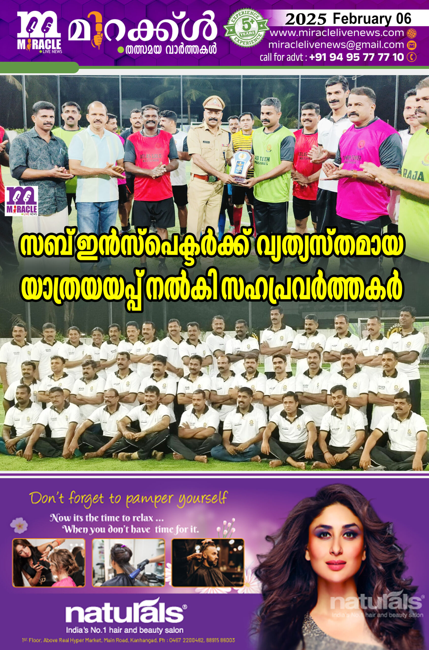 നീലേശ്വരം : നീലേശ്വരം പോലീസ് സ്റ്റേഷനില് നിന്നും സ്ഥലം മാറിയ സബ് ഇന്സ്പെക്ടര് എം.വി വിഷ്ണുപ്രസാദിന് വ്യത്യസ്തമായ യാത്രയയപ്പ് നല്കി നീലേശ്വരം പോലീസ് സ്റ്റേഷനിലെ സഹപ്രവര്ത്തകര്. സ്റ്റേഷനിലെ മുഴുവന് സഹപ്രവര്ത്തകരും നാല് ഫുട്ബോള് ടീമുകള് രൂപീകരിച്ച് ഫുട്ബോള് ടൂര്ണ്ണമെന്റ് സംഘടിപ്പിച്ചു കൊണ്ടാണ് സ്ഥലം മാറി പോകുന്ന സബ് ഇന്സ്പെക്ടര് എം വി വിഷ്ണുപ്രസാദിന് ഫുട്ബോള് മൈതാനത്ത് വെച്ച് സ്നേഹോപഹാരം നല്കിയത്.