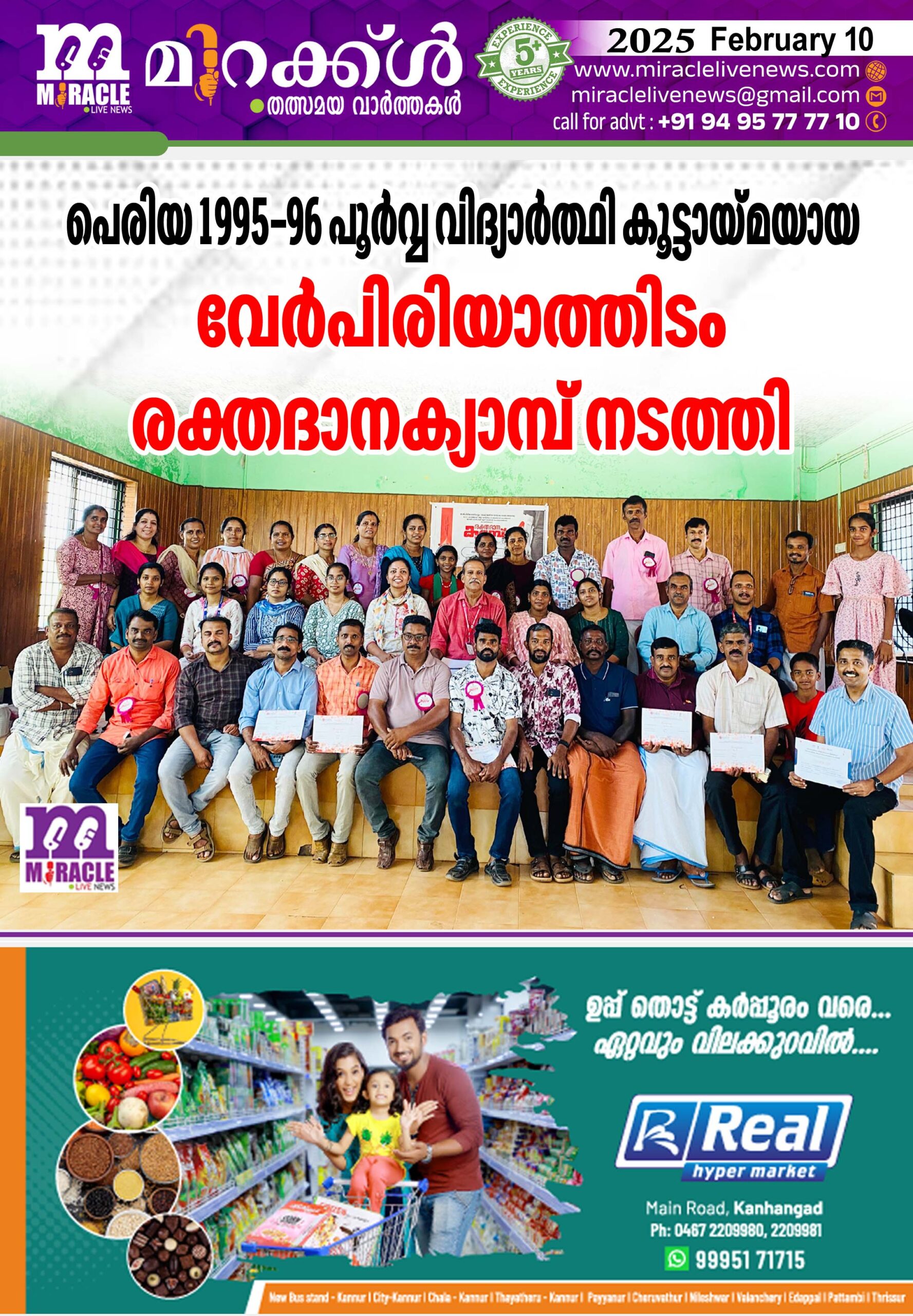 പെരിയ 1995-96 പൂര്വ്വ വിദ്യാര്ത്ഥി കൂട്ടായ്മയായ വേര്പിരിയാത്തിടം രക്തദാനക്യാമ്പ് നടത്തി