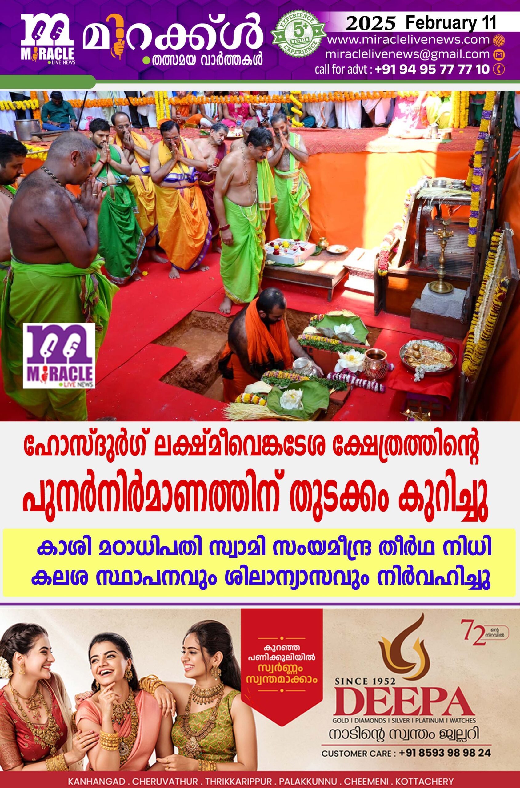 ഹോസ്ദുര്ഗ് ലക്ഷ്മീവെങ്കടേശ ക്ഷേത്രത്തിന്റെ പുനര്നിര്മാണത്തിന് തുടക്കം കുറിച്ചു; കാശി മഠാധിപതി സ്വാമി സംയമീന്ദ്ര തീര്ഥ നിധികലശ സ്ഥാപനവും ശിലാന്യാസവും നിര്വഹിച്ചു