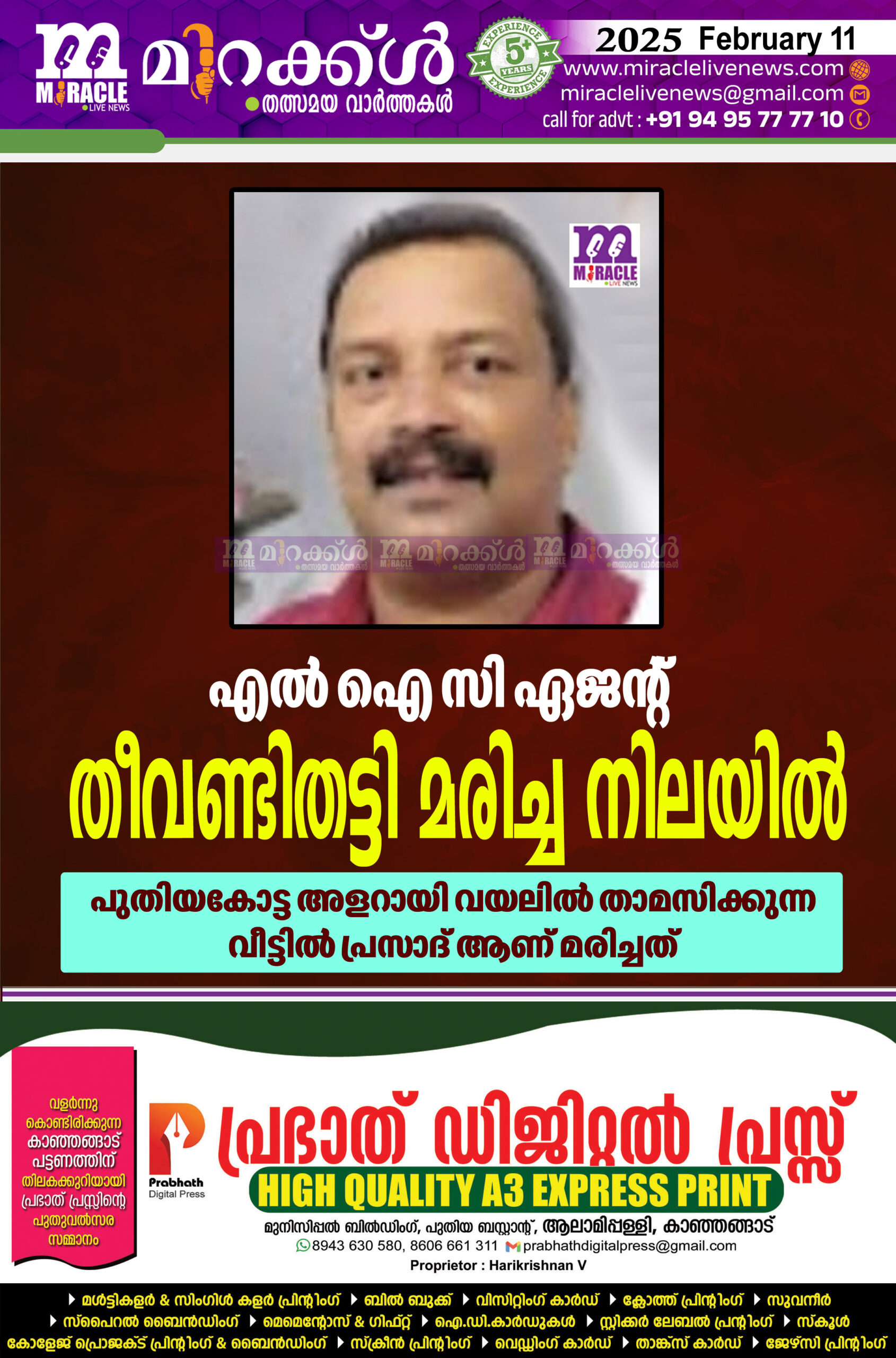 എല്‍ ഐ സി ഏജന്റ് തീവണ്ടിതട്ടി മരിച്ച നിലയില്‍; പുതിയകോട്ട അളറായി വയലില്‍ താമസിക്കുന്ന വീട്ടില്‍ പ്രസാദ് ആണ് മരിച്ചത്