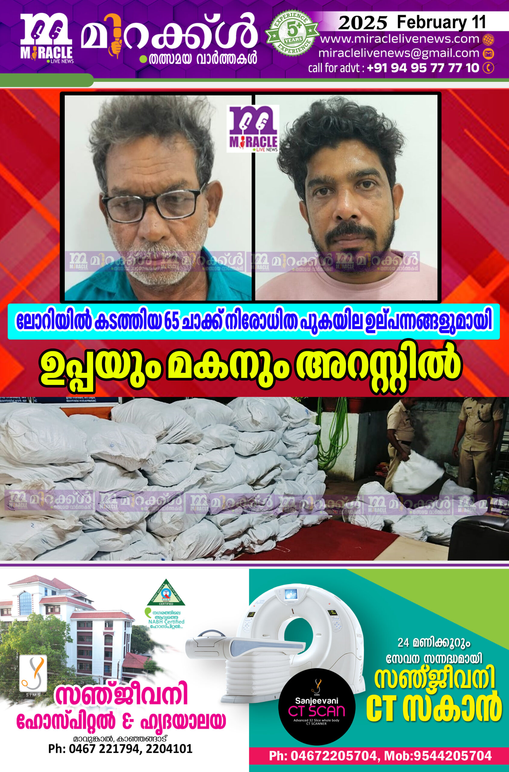 ലോറിയില്‍ കടത്തിയ 65 ചാക്ക് നിരോധിത പുകയില ഉല്പന്നങ്ങളുമായി ഉപ്പയും മകനും അറസ്റ്റില്‍