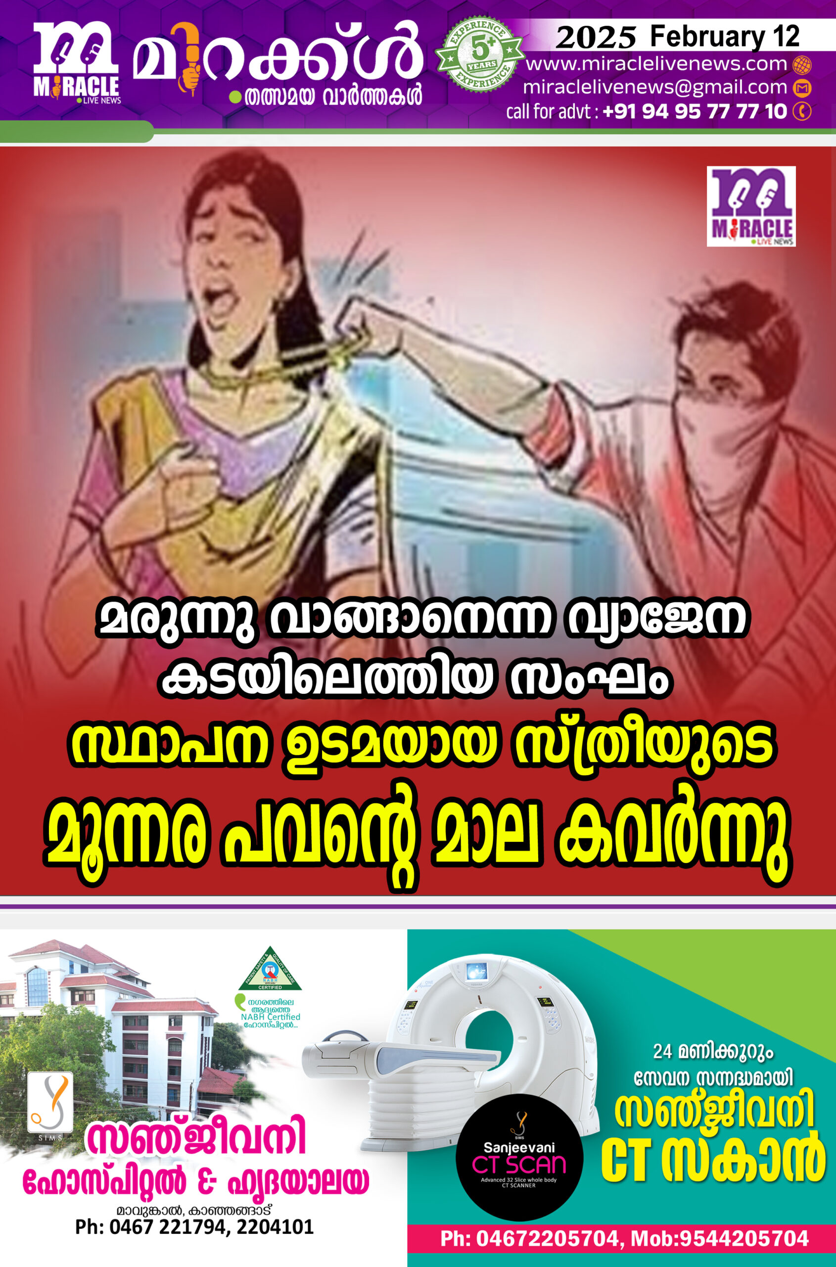 ബദിയടുക്ക : ആയുര്വേദ കടയില് മരുന്നു വാങ്ങാനെന്ന വ്യാജേന രണ്ടംഗ സംഘം സ്ഥാപന ഉടമയായ സ്ത്രീയുടെ മൂന്നര പവന്റെ മാല കവര്ന്നു. നീര്ച്ചാല് ജെയ്ന് മൂല സ്വദേശിനി എസ്.എന്. സരോജിനിയുടെ (64) കഴുത്തിലണിഞ്ഞ മൂന്നര പവന്റെ കരിമണിമാലയാണ് കവര്ന്നത്. ചൊവ്വാഴ്ച വൈകിട്ട് 3.25 മണിയോടെ പരാതിക്കാരി മീത്തലെ നീര്ച്ചാലില് നടത്തുന്ന ശ്രീരാഘ വേന്ദ്ര ആയുര്വേദിക് മെഡിക്കല്സില് മരുന്ന് വാങ്ങാനെന്ന വ്യാജേന ബൈക്കിലെത്തിയ രണ്ടുപേരില് ഒരാള് അകത്ത് കയറി സ്ത്രീയുടെ കഴുത്തില് ധരിച്ചിരുന്ന 1,90,000 രൂപവിലമതിക്കുന്ന മൂന്നര പവന്റെ കരിമണി മാല കഴുത്ത് ഞെരിച്ച് പൊട്ടിച്ച ശേഷം ബൈക്കില് രക്ഷപ്പെടുകയായിരുന്നു. തുടര്ന്ന് പോലീസില് പരാതി നല്കി. കേസെടുത്ത പോലീസ് അന്വേഷണം തുടങ്ങി.