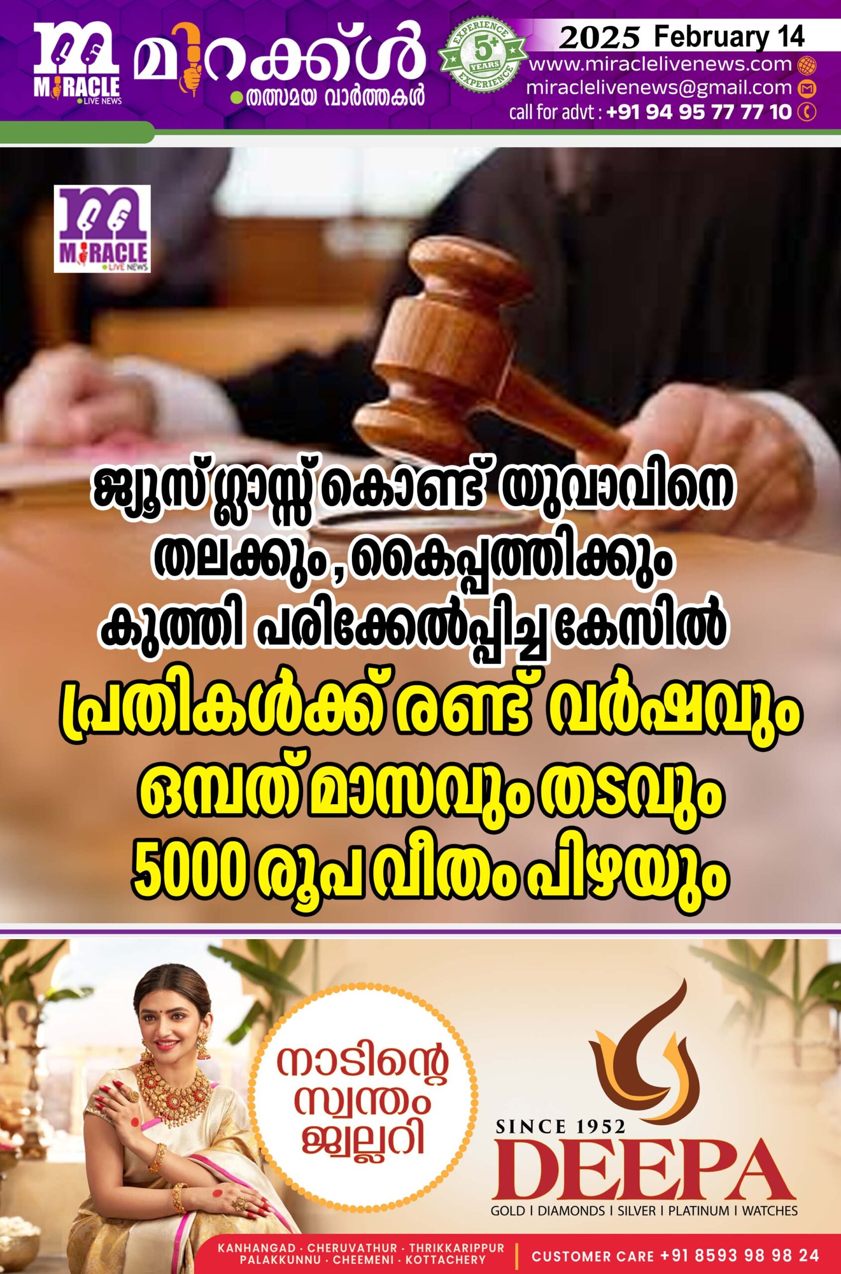 കാസര്കോട്: ചെര്ക്കള ഐഡിയല് കൂള് ബാറില് വെച്ച് സഹപാഠികളുമൊത്ത് ഐസ്ക്രീം കഴിക്കുകയായിരുന്ന അംഗടിമുഗര് സ്വദേശിയായ പ്രിഥ്വിരാജിനെ സംഘം ചേര്ന്ന് തടഞ്ഞു നിര്ത്തി ജൂസ് ഗ്ലാസ്സ് കൊണ്ട് തലക്കും , കൈപ്പത്തിക്കും കുത്തി പരിക്കേല്പ്പിച്ച കേസില് രണ്ട് വര്ഷവും ഒമ്പത് മാസവും തടവും 5000 രൂപ വീതം പിഴയും.