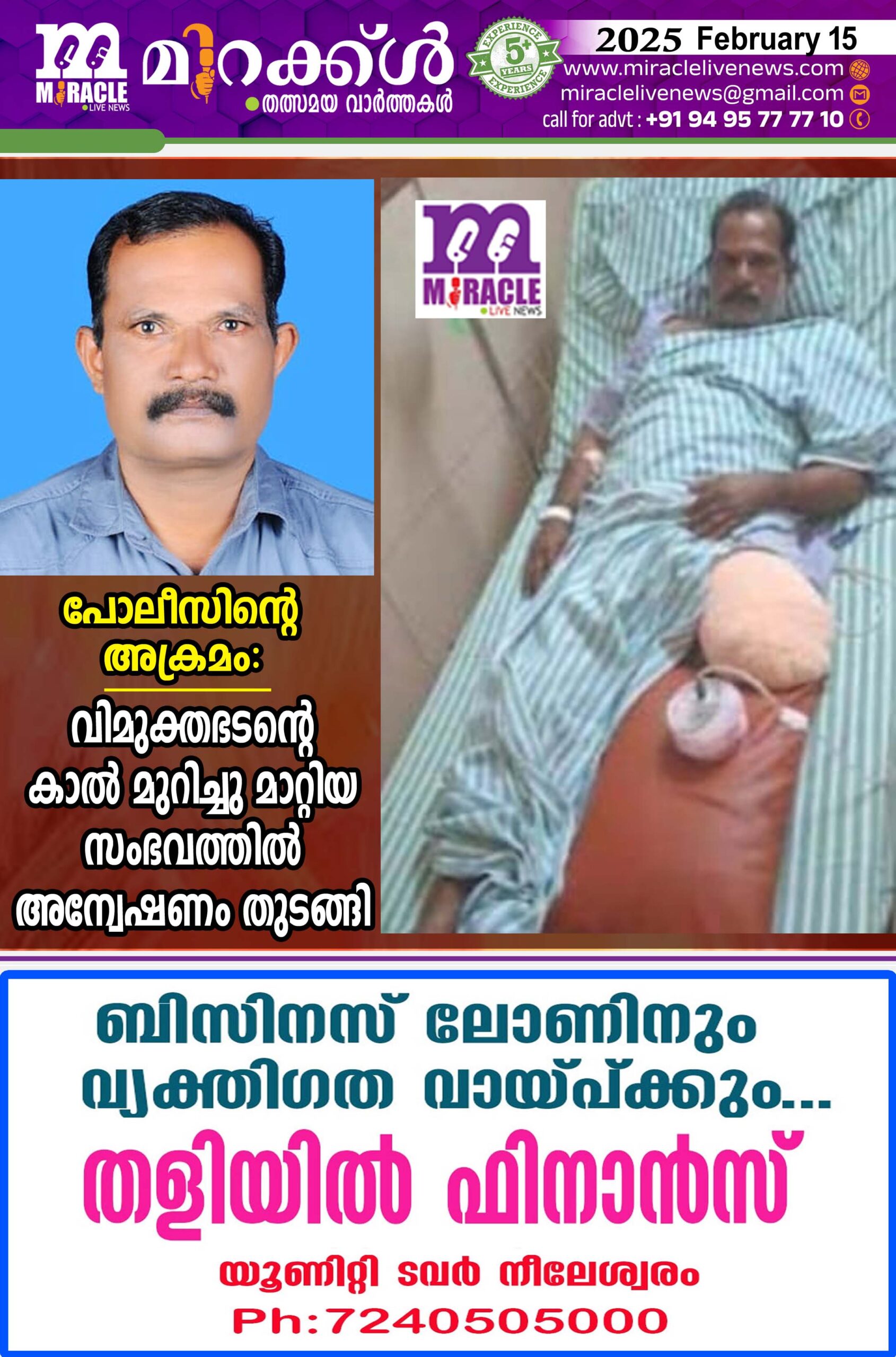 നീലേശ്വരം : റെയില്വേ പോലീസിന്റെ ക്രൂര മര്ദ്ദനത്തില് പരിക്കേറ്റ മലയാളി ജവാന്റെ കാല്മുറിച്ചു മാറ്റി. നീലേശ്വരം അങ്കക്കളരിയിലെ പി.വി.സുരേശന്റെ(54) കാലാണ് മംഗലാപുരം ഫാദര് മുള്ളേഴ്സ് ആ ശുപത്രിയില് മുട്ടിന് മുകളില് വെച്ച് മുറിച്ചുമാറ്റിയത്.