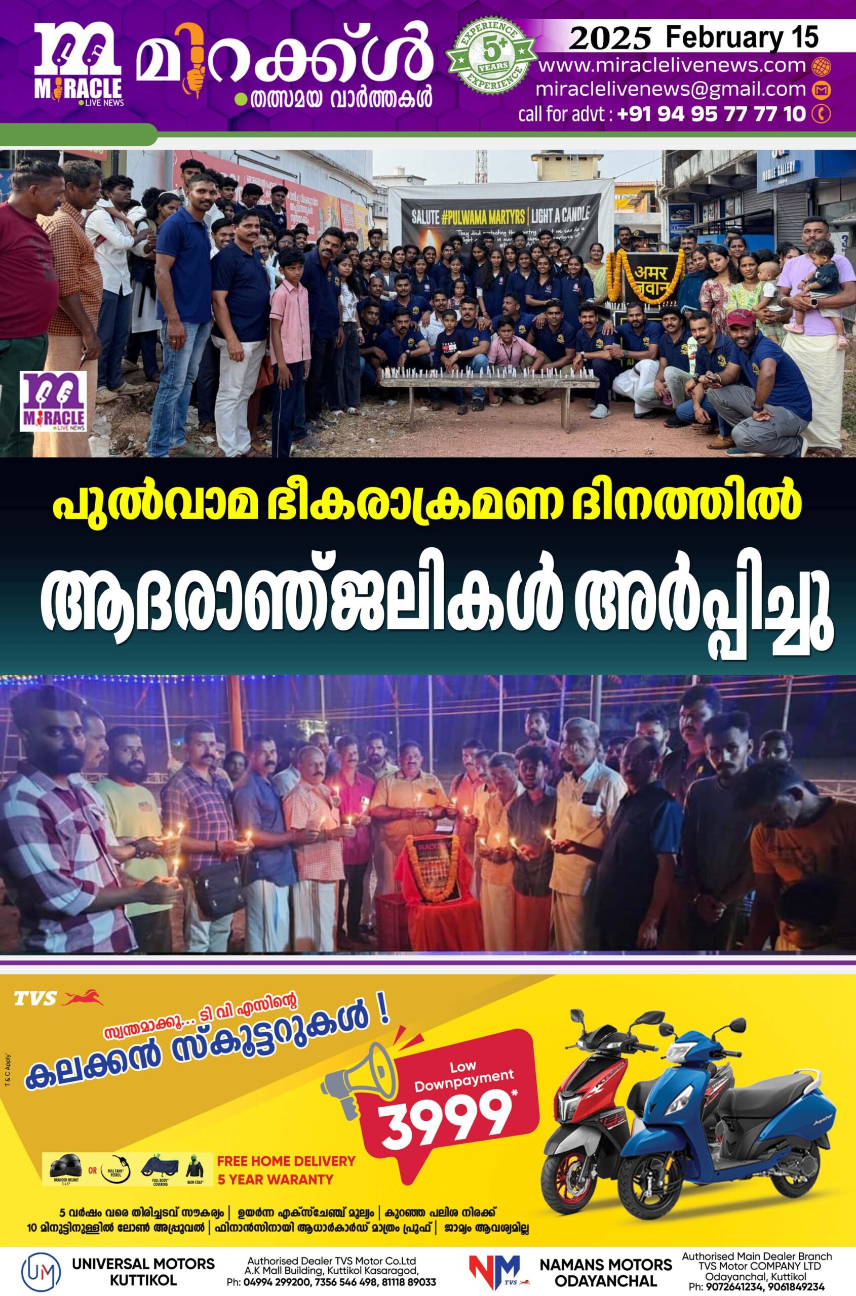 ചീമേനി :പുല്വാമ ഭീകരാക്രമണ ദിനത്തിന്റെ ജ്വലിക്കുന്ന ഓര്മ്മകള്ക്കുമുന്നില് പ്രണാമം അര്പ്പിച്ചുകൊണ്ട് സോള്ജിയേഴ്സ് ഓഫ് കെ എല് -14 വെല്ഫെയര് സൊസൈറ്റിയും, ചീമേനി എന്ജിനീയറിംഗ് കോളേജ് എന്എസ്എസ് വളണ്ടിയര്മാരും ചീമേനി ടൗണില് വച്ച് മെഴുകുതിരി കത്തിച്ച് ആദരാഞ്ജലികള് അര്പ്പിച്ചു. പോലീസ് എസ് എച്ച് ഒ ഇന്സ്പെക്ടര് അനില്കുമാര് മെഴുകുതിരി തെളിയിച്ച് ചടങ്ങ് ഉദ്ഘാടനം ചെയ്തു . പ്രസിഡന്റ് ശശിധരന് അധ്യക്ഷനായി. അഡ്മിന് ശ്രീജിത്ത് നേതൃത്വം നല്കി. മെമ്പര്മാരും കുടുംബാംഗങ്ങളും നാട്ടുകാരും പരിപാടിയില് സംബന്ധിച്ചു.മാവുങ്കാലില് സംഘപരിവാര് പ്രവര്ത്തകരുടെ