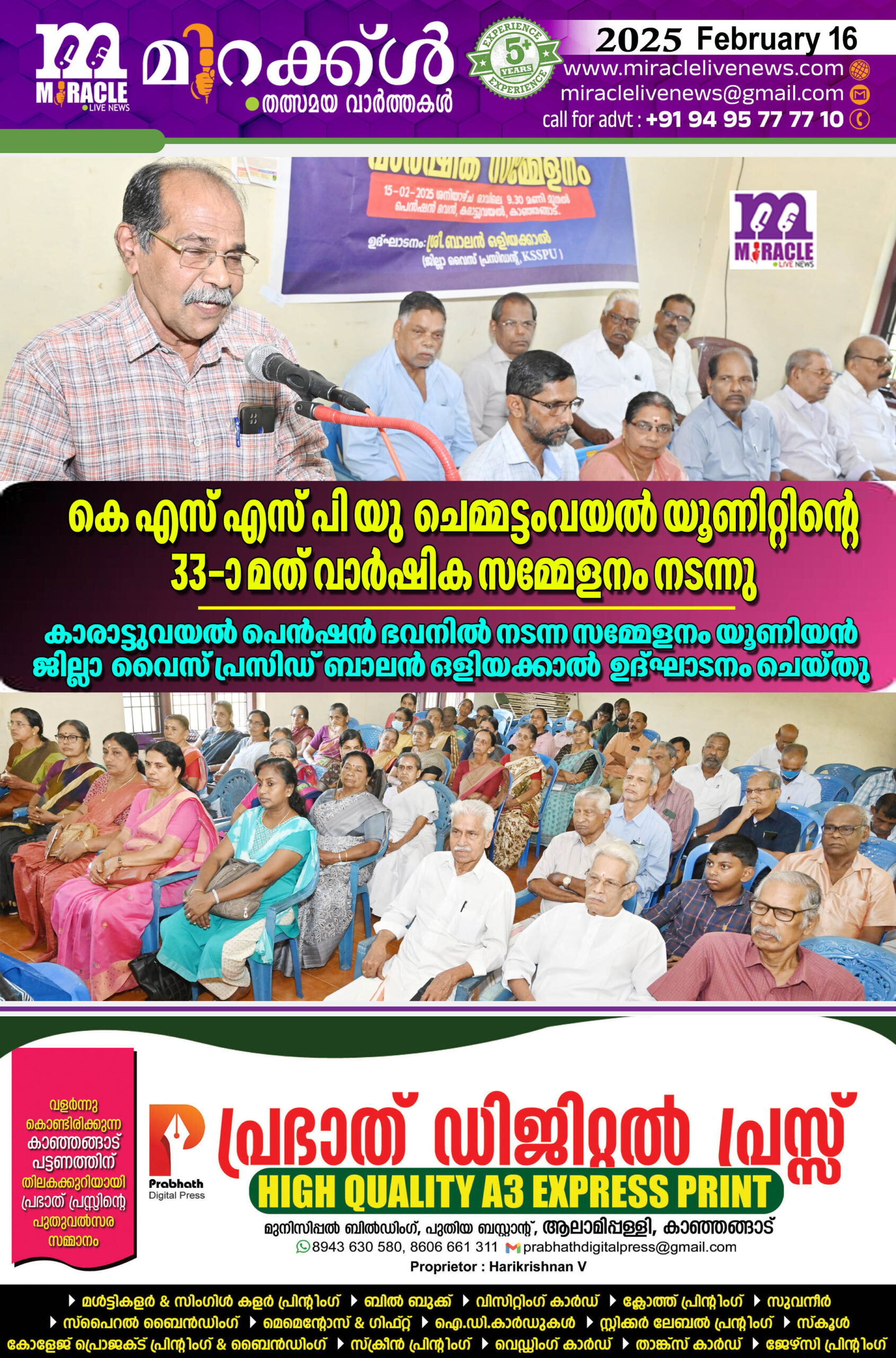 കാഞ്ഞങ്ങാട്: കേരള സ്റ്റേറ്റ് സര്വീസ് പെന്ഷനേഴ്സ് യൂണിയന് ചെമ്മംട്ടംവയല് യൂണിറ്റിന്റെ 33മത് വാര്ഷിക സമ്മേളനം നടന്നു.കാരാട്ട് വയല് പെന്ഷന് ഭവനില് നടന്ന സമ്മേളനം യൂണിയന് ജില്ലാ കമ്മിറ്റി വൈസ് പ്രസിഡന്റ് ഉദ്ഘാടനം ചെയ്തു. തുടര്ന്ന് മുതിര്ന്ന പെന്ഷണര് പി.എ.രാമന് ,റിട്ട:എ ഡി സി യുടെ ഛായാചിത്രം മുതിര്ന്ന പെന്ഷണര് ചെല്ലപ്പന് ആചാരി നിര്വ്വഹിച്ചു. യൂണിറ്റ്’ പ്രസിഡണ്ട് എന് രാധ അധ്യക്ഷത വഹിച്ചു. വൈസ് പ്രസിഡന്റ് കെ.വി.കുഞ്ഞമ്പു അനുശോചനവും സെക്രട്ടറി കെ വി കുഞ്ഞികൃഷ്ണന് പ്രവര്ത്തന റിപ്പോര്ട്ടും ട്രഷറര് കെ.വിജയന് വരവ് ചെലവ് കണക്കുകളും അവതരിപ്പിച്ചു. ജില്ലാ ട്രഷറര് എസ് ഗോപാലകൃഷ്ണന്,ജില്ല കമ്മിറ്റി ജോ:സെക്രട്ടറി പി. വി. കമലാക്ഷി ,ജില്ലാ കമ്മിറ്റി അംഗം വി.വി.ബാലകൃഷ്ണന് , ബ്ലോക്ക് പ്രസിഡന്റ് ബി.പരമേശ്വരന്,പനത്തടി നാരായണന് എന്നിവര് സംസാരിച്ചു. വൈസ് പ്രസിഡന്റ് എം.രാമചന്ദ്രന് സ്വാഗതവും കെ.വി. സതി ടീച്ചര് നന്ദിയും പറഞ്ഞു. ജോയിന്റ് സെക്രട്ടറി കെ. രേണുക പ്രമേയം അവതരിപ്പിച്ചു. ബ്ലോക്ക് കമ്മിറ്റി അംഗം കെ രവീന്ദ്രന് വരണാധികാരിയായി ഭാരവാഹികളുടെ തെരഞ്ഞെടുപ്പും നടത്തി. പ്രസിഡന്റ് എന് രാധ ,സെക്രട്ടറി കെ.വി.കുഞ്ഞികൃഷ്ണന് ,ട്രഷറര് കെ.വിജയന് എന്നിവരെ തെരഞ്ഞെടുത്തു.2024 ജൂലായ് 1ന് പ്രാബല്യത്തില് പെന്ഷന് പരിഷ്ക്കരിക്കുന്നതിനുള്ള നടപടി ആരംഭിക്കുക.