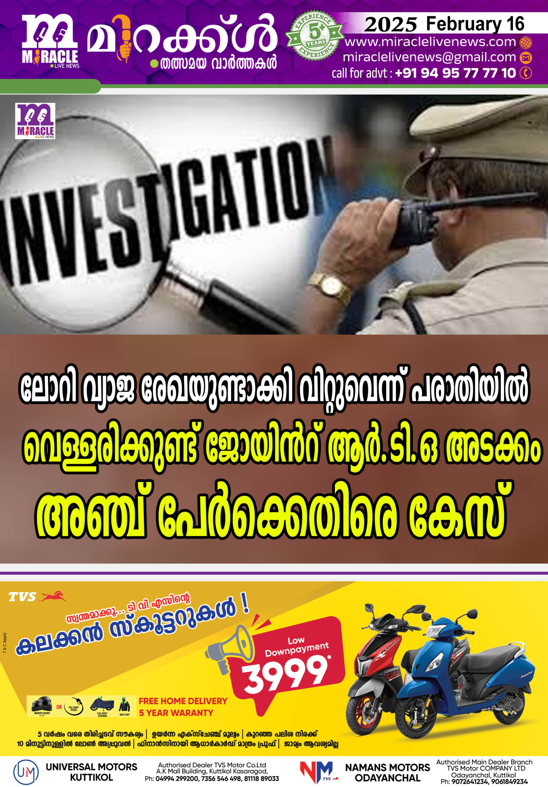 ലോറി വ്യാജ രേഖയുണ്ടാക്കി വിറ്റുവെന്ന് പരാതിയില്‍ വെള്ളരിക്കുണ്ട് ജോയിന്റ് ആര്‍.ടി.ഒ. അടക്കം അഞ്ച് പേര്‍ക്കെതിരെ കേസ്.