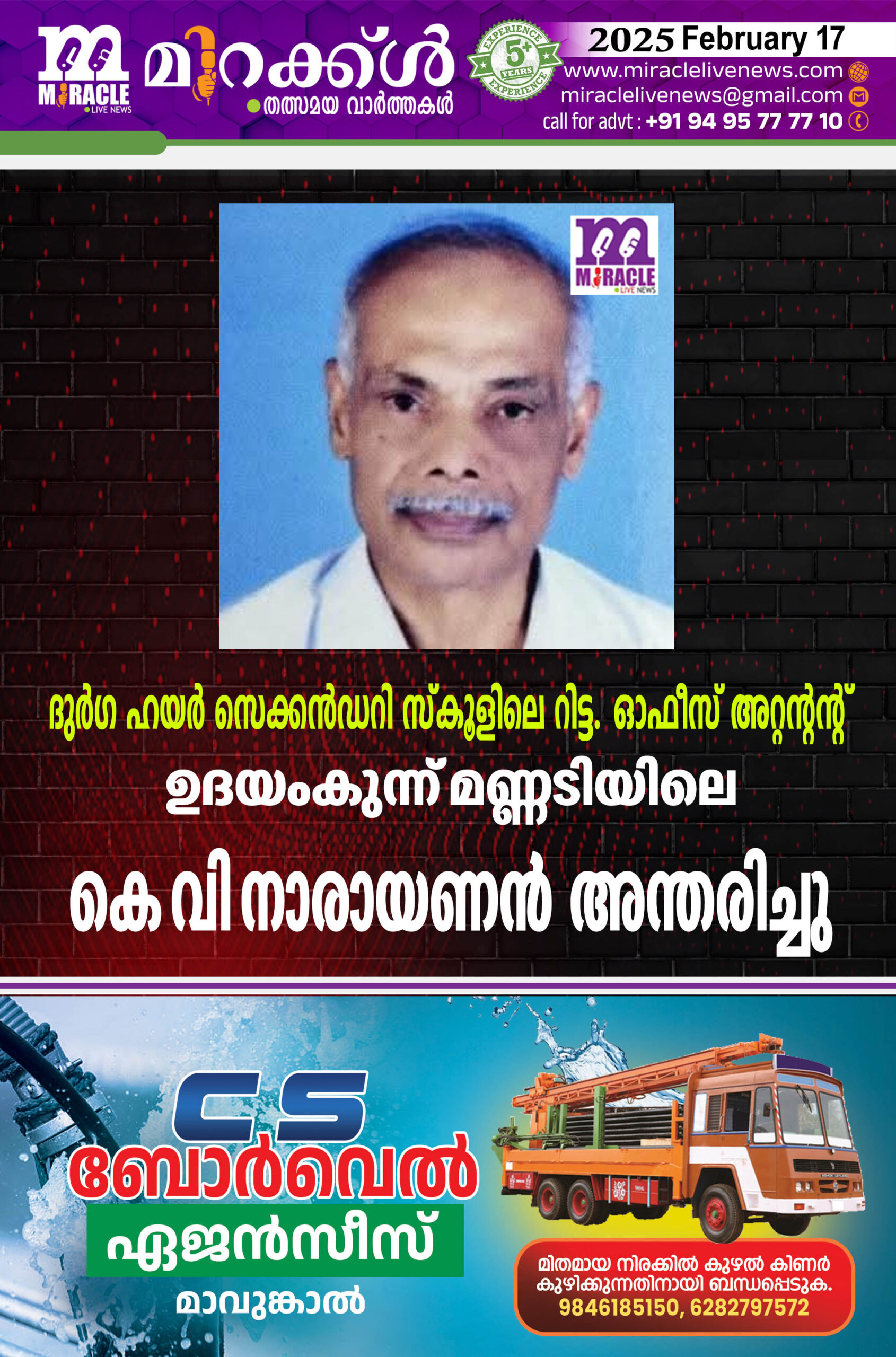 ദുര്‍ഗ ഹയര്‍ സെക്കന്‍ഡറി സ്‌കൂളിലെ റിട്ട. ഓഫീസ് അറ്റന്റന്റ് ഉദയംകുന്ന് മണ്ണടിയിലെ കെ വി നാരായണന്‍ അന്തരിച്ചു