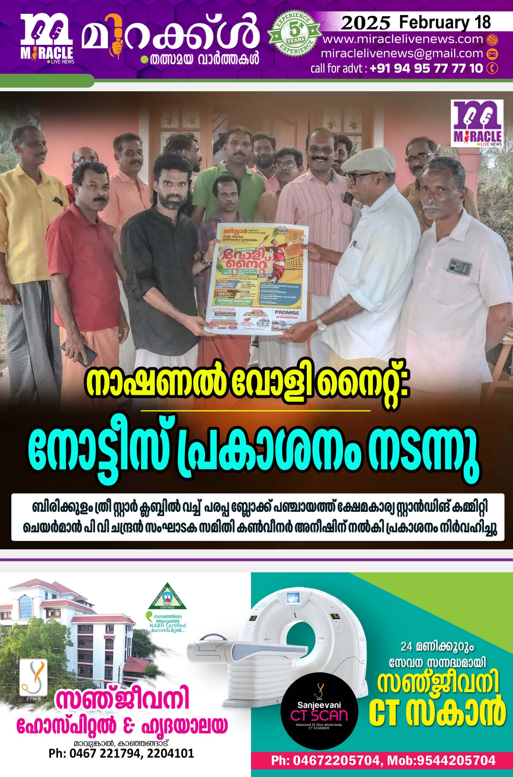 ബിരിക്കുളം: ത്രീസ്റ്റാര്‍ ആര്‍ട്‌സ് ആന്‍ഡ് സ്‌പോര്‍ട്‌സ് ക്ലബ്ബും പിജി സ്മാരക വായനശാലയും സംയുക്ത ആഭിമുഖ്യത്തില്‍ 2025 ഏപ്രില്‍ 5 ന് നടത്തുന്ന നാഷണല്‍ വോളി നൈറ്റിന്റെ നോട്ടീസ് പ്രകാശനം ബിരിക്കുളം ത്രീ സ്റ്റാര്‍ ക്ലബ്ബില്‍ വച്ച് നടത്തി. പരപ്പ ബ്ലോക്ക് പഞ്ചായത്ത് ക്ഷേമകാര്യ സ്റ്റാന്‍ഡിങ് കമ്മിറ്റി ചെയര്‍മാന്‍ പി വി ചന്ദ്രന്‍ സംഘാടക സമിതി കണ്‍വീനര്‍ അനീഷിന് നല്‍കി കൊണ്ട് പ്രകാശനം നിര്‍വഹിച്ചു. ടി. എ രവി, ആഷിക് അബു, സന്തോഷ് എ എസ്, വിജയന്‍ കെ വി, രത്‌നാകരന്‍ മധു പി, എന്നിവര്‍സംസാരിച്ചു.