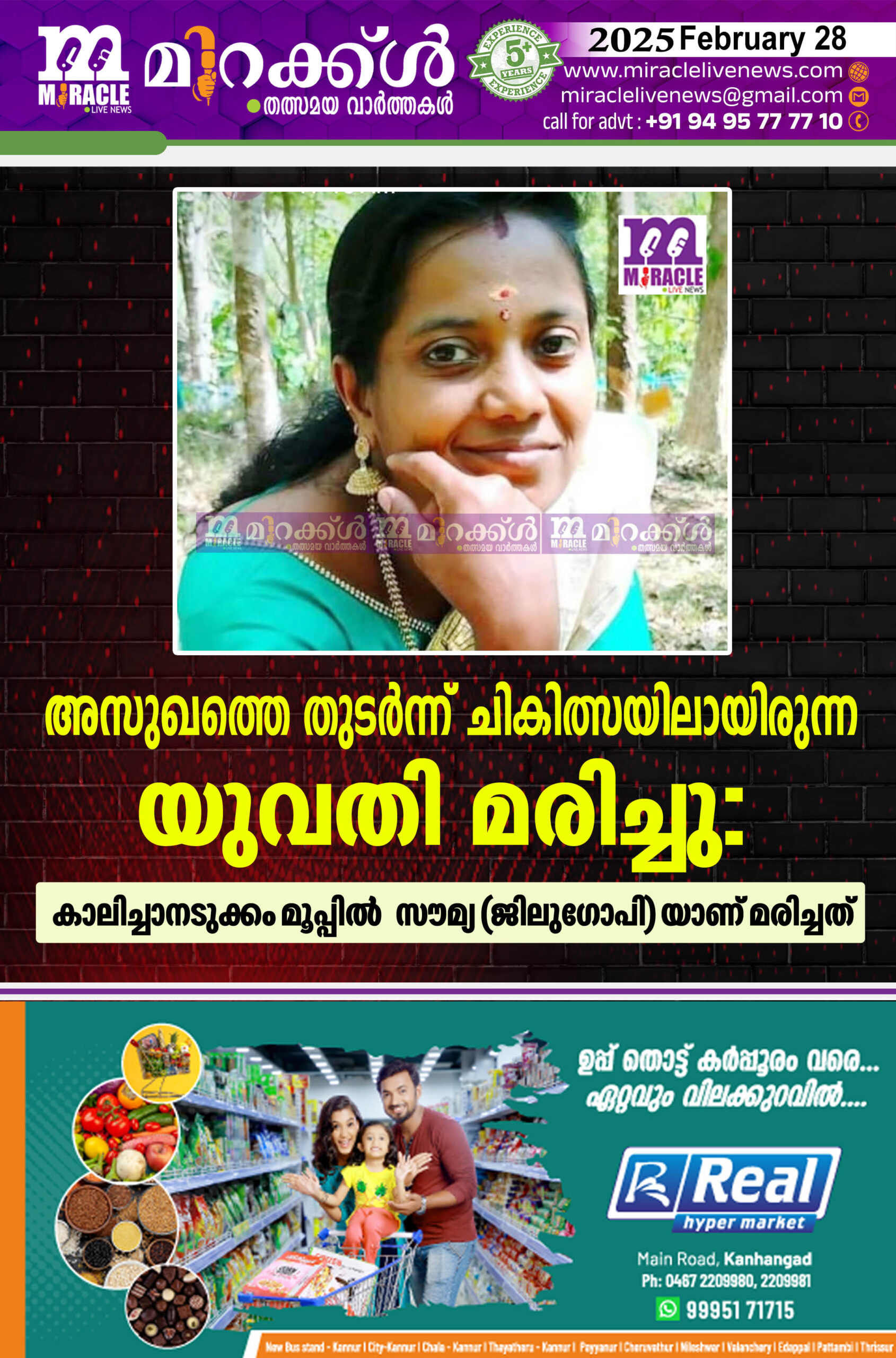 അസുഖത്തെ തുടര്‍ന്ന് ചികിത്സയിലായിരുന്ന യുവതി മരിച്ചു: കാലിച്ചാനടുക്കം മൂപ്പില്‍ സൗമ്യ (ജിലുഗോപി) യാണ് മരിച്ചത്