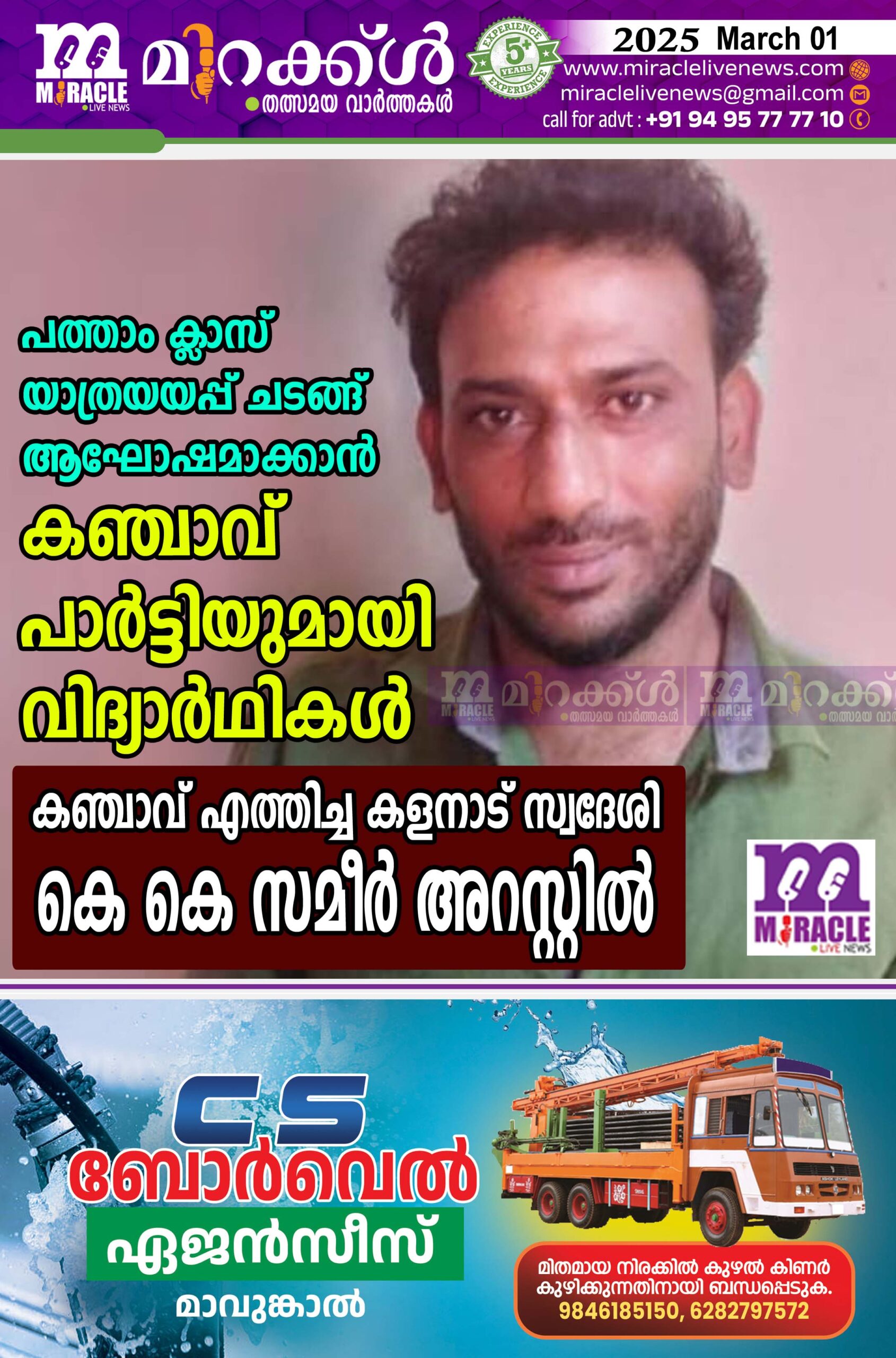 പത്താം ക്ലാസ് യാത്രയയപ്പ് ചടങ്ങ് ആഘോഷമാക്കാന്‍ കഞ്ചാവ് പാര്‍ട്ടിയുമായി വിദ്യാര്‍ഥികള്‍; കഞ്ചാവ് എത്തിച്ച കളനാട് സ്വദേശി കെ കെ സമീര്‍ അറസ്റ്റില്‍