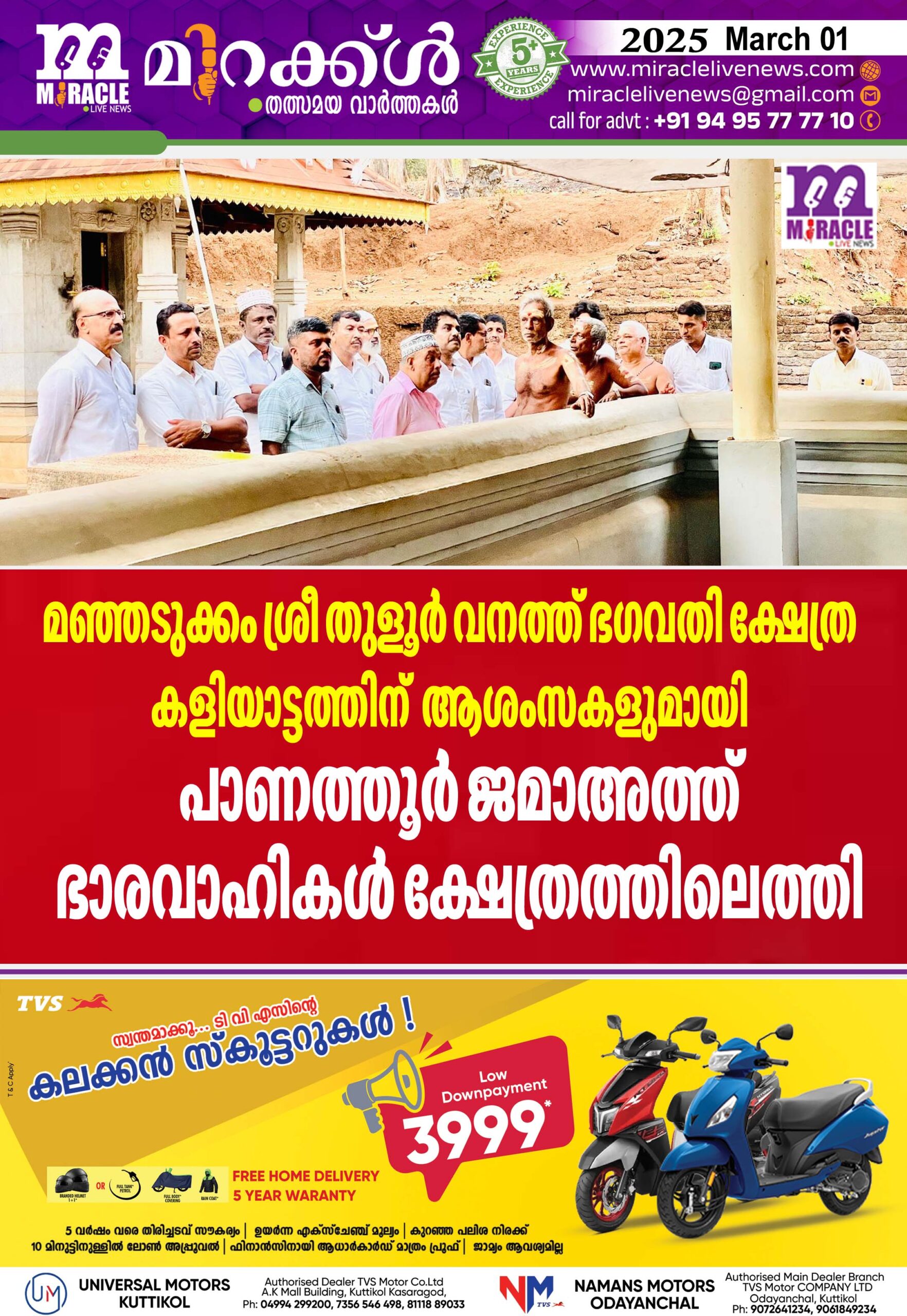 പാണത്തൂര്‍ : കളിയാട്ടം നടക്കുന്ന പാണത്തൂര്‍ മഞ്ഞടുക്കം ശ്രീ തുളൂര്‍ വനത്ത് ഭഗവതി ക്ഷേത്രത്തില്‍ ആശംസ നേരാന്‍ പാണത്തൂര്‍ ജമാഅത്ത് ഭാരവാഹികളെത്തി. ജമാ അത്ത് ഭാരവാഹികളെ കാട്ടൂര്‍ തമ്പാന്‍ നമ്പ്യാരുടെ നേതൃത്വത്തില്‍ ക്ഷേത്ര ഭാരവാഹികള്‍ സ്വീകരിച്ചു.വര്‍ഷങ്ങളായി മഞ്ഞടുക്കം ശ്രീ തുളൂര്‍ വനത്ത് ഭഗവതി ക്ഷേത്ര കളിയാട്ടത്തിന് ആശംസകള്‍ നേര്‍ന്നുകൊണ്ട് പാണത്തൂര്‍ ജമാഅത്ത് ഭാരവാഹികളും, പാണത്തൂര്‍ മഖാം ഉറൂസിന് ആശംസകള്‍ നേര്‍ന്നു കൊണ്ട് മഞ്ഞടുക്കം ശ്രീ തുളൂര്‍ വനത്ത് ഭഗവതി ക്ഷേത്രം ഭാരവാഹികളും പരസ്പര സന്ദര്‍ശനം നടത്താറുണ്ട്. രണ്ട് ആരാധനാലയങ്ങളും തമ്മില്‍ പൗരാണികമായ ചില ബന്ധങ്ങള്‍ നിലനില്‍ക്കുന്നുണ്ട്. ഇത് തുടര്‍ന്ന് കൊണ്ടുപോകാന്‍ ഇരു ആരാധനാലയ ഭാരവാഹികളും ശ്രദ്ധ ചെലുത്താറുമുണ്ട്. ക്ഷേത്ര ഭാരവാഹികളുടെ ആദിത്യം ഏറ്റുവാങ്ങി പരസ്പര സ്‌നേഹത്തിന്റെയും, മതേതരത്വത്തിന്റെയും നന്മയുള്ള സന്ദേശം പരസ്പരം കൈമാറി മടങ്ങുമ്പോള്‍ 2025 ഏപ്രില്‍ 10 മുതല്‍ നടക്കുന്ന ഉറൂസിന് ക്ഷേത്ര കമ്മിറ്റി ഭാരവാഹികളെയും മുഴുവന്‍ ഭക്തജനങ്ങളെയും ജമാഅത്ത് ഭാരവാഹികള്‍ സ്‌നേഹദരവുകളോടുകൂടി ക്ഷണിച്ചു. ജമാ അത്ത് ഭാരവാഹികളായ കെ.കെ. അബ്ദുള്‍ റഹ്‌മാന്‍, മുനീര്‍ പി.കെ, അസീസ് കോപ്പട്ടി, ഖാലിദ് കോളനി, അബ്ബാസ് എം.ബി, ജമാല്‍ എം.ബി, മൊയ്തു കുണ്ടുപ്പള്ളി, മുഹമ്മദ് കുഞ്ഞി പി.എ,സലീം കെ.സി എന്നിവരും മറ്റ് ചില മഹല്‍ അംഗങ്ങളുമാണ് ക്ഷേത്രത്തിലെത്തിയത്.