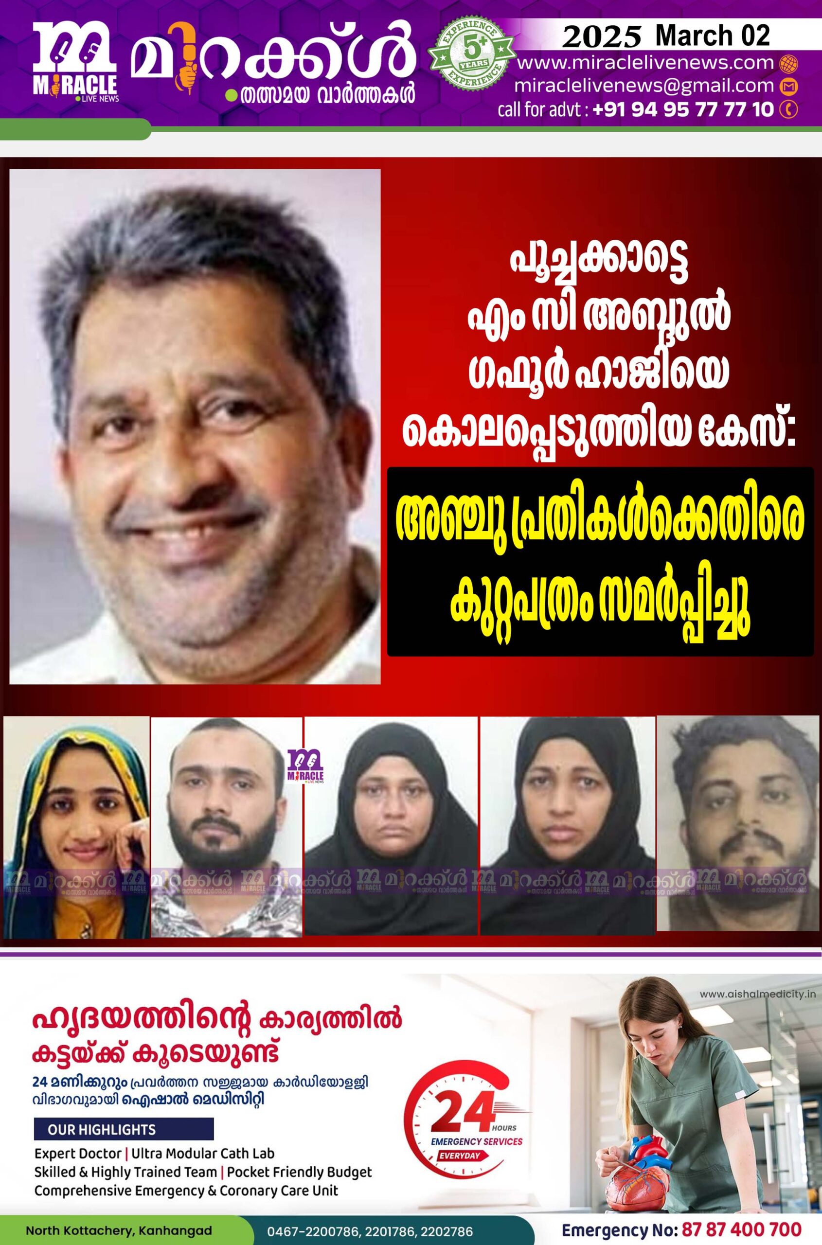 പൂച്ചക്കാട്ടെ എം സി അബ്ദുല്‍ ഗഫൂര്‍ ഹാജിയെ കൊലപ്പെടുത്തിയ കേസ്: അഞ്ചു പ്രതികള്‍ക്കെതിരെ കുറ്റപത്രം സമര്‍പ്പിച്ചു