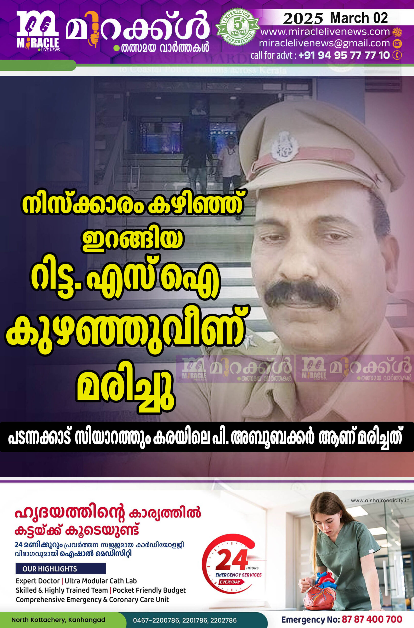 കാഞ്ഞങ്ങാട് : നിസ്ക്കാരം കഴിഞ്ഞ് ഇറങ്ങിയ റിട്ട. എസ് ഐ കുഴഞ്ഞുവീണ് മരിച്ചു. പടന്നക്കാട് അനന്തംപള്ള സിയാറത്തും കരയിലെ പി. അബൂബക്കര് (60) ആണ് മരിച്ചത്. ഇന്നലെ രാത്രി 10 ന് സിയാറത്തുംകര പള്ളിയില് നിസ്കാരം പള്ളിയില് നിന്നും വീട്ടിലേക്ക് നടന്ന് പോകവെ റോഡില് കുഴഞ്ഞുവീഴുകയായിരുന്നു. ഒപ്പമുണ്ടായിരുന്നവര് ഉടന് കാഞ്ഞങ്ങാട് ഐഷാല് മെഡിസിറ്റിയില് എത്തിച്ചുവെങ്കിലും മരണം സംഭവിച്ചിരുന്നു . ഹൃദയാഘാതമാണ് മരണ കാരണമെന്ന് കരുതുന്നു. ഹോസ്ദുര്ഗ് സര്ക്കിള് ഇന്സ്പെക്ടര് ഓഫീസില് വര്ഷങ്ങളോളം സേവനമനുഷ്ഠിച്ചിട്ടുണ്ട്. സംസ്കാരം ഇന്ന് ഉച്ചയ്ക്ക് നടക്കും. ഭാര്യ: സാറ. മക്കള്: നൗഫല്, ഫിറോസ്, സിറാജ്.