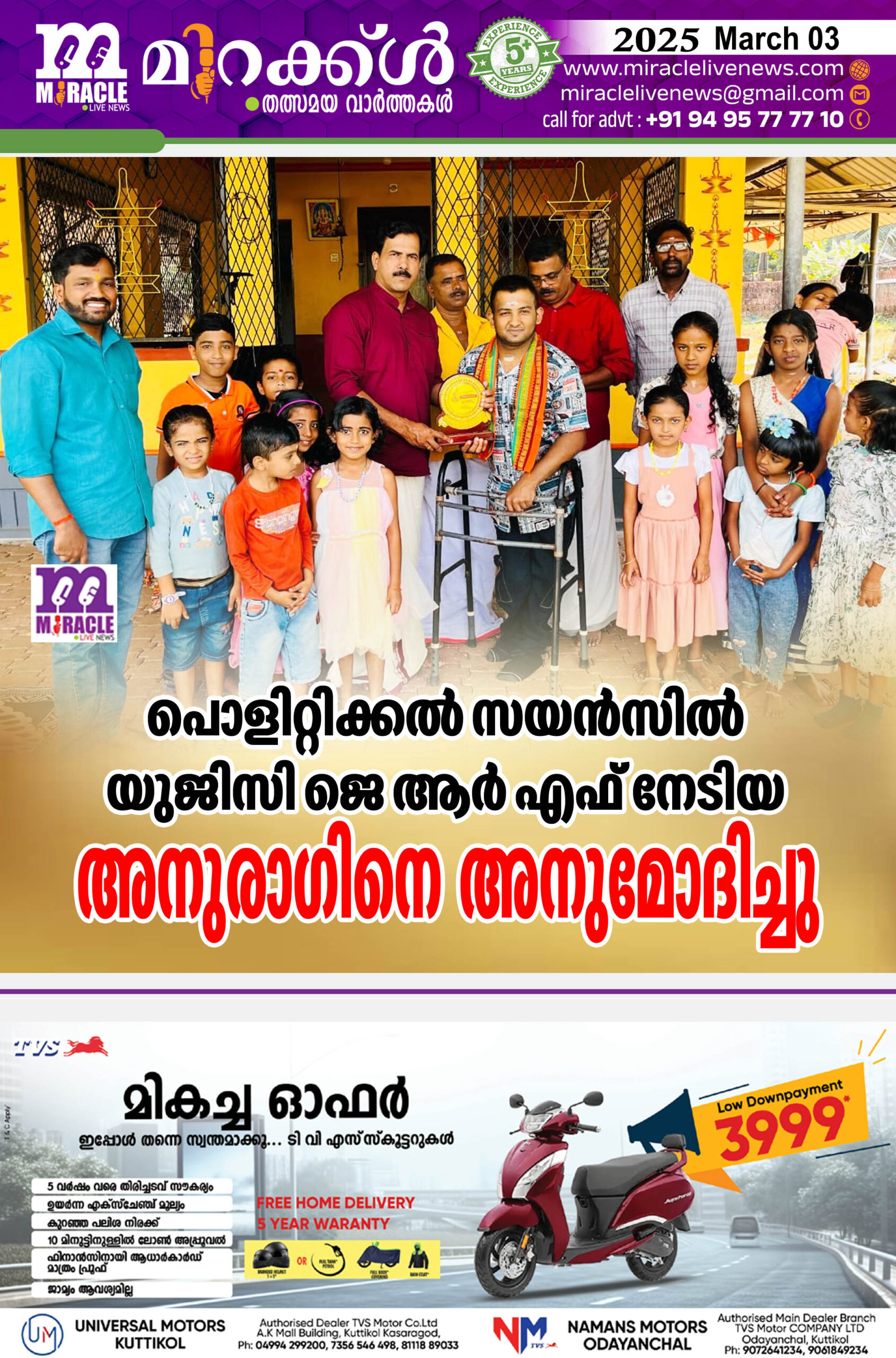 പൊളിറ്റിക്കല് സയന്സില് യുജിസി ജെ ആര് എഫ് നേടിയ അനുരാഗിനെ അനുമോദിച്ചു