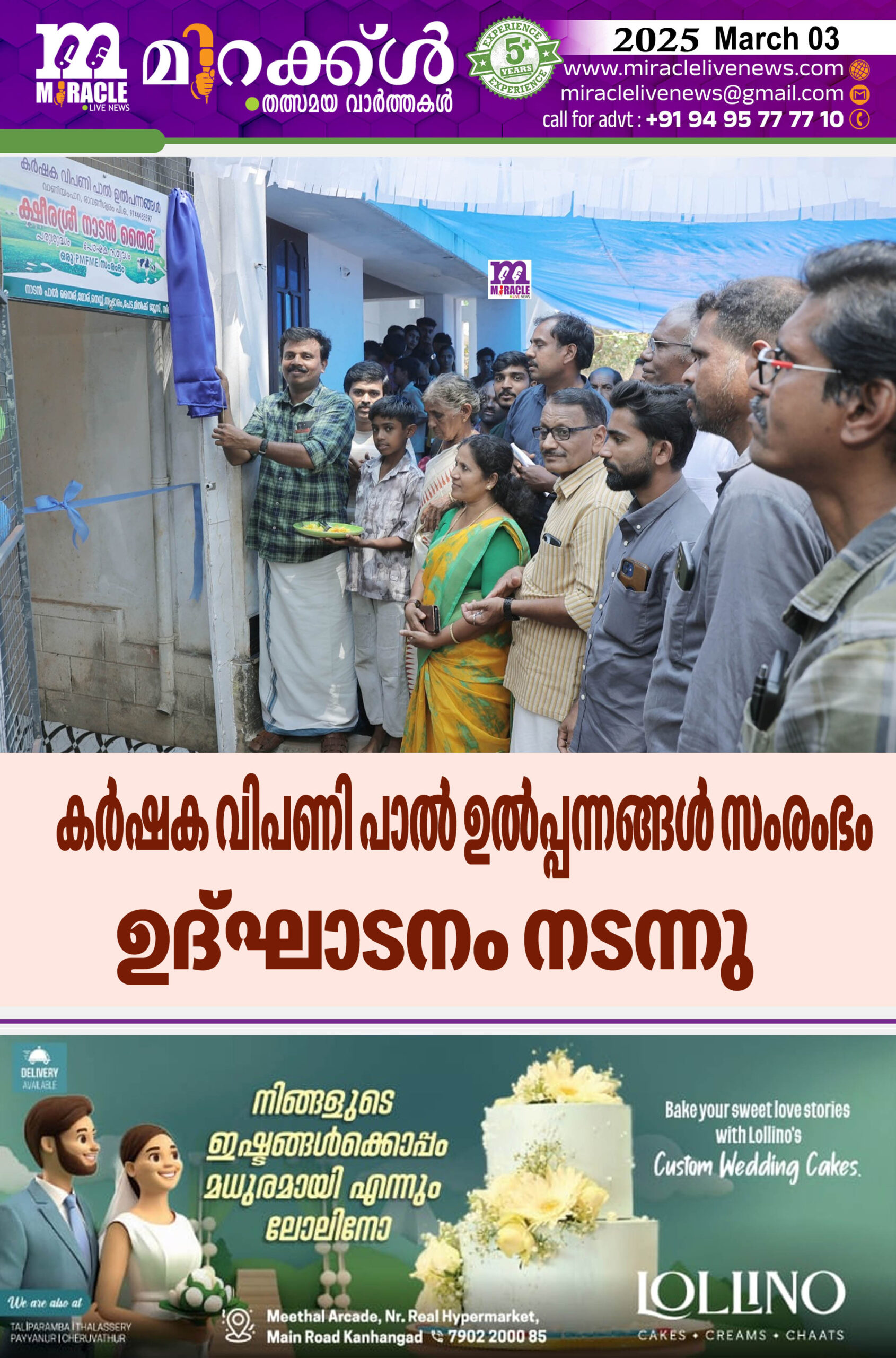 രാവണേശ്വരം : വ്യവസായ വകുപ്പിന്റെ സംരംഭക സഹായ പദ്ധതി പ്രകാരം വാണിയംപാറയില് കര്ഷക വിപണി പാല് ഉല്പ്പന്നങ്ങള് എന്ന പേരില് ചെറുകിട സംരംഭം ആരംഭിച്ചു. പരിശുദ്ധമായ നാടന്പാല് തൈര് മോര് സംഭാരം സിപ്പപ്പ് ഐസ് പേട തുടങ്ങിയവ നിര്മ്മിച്ച വിപണിയില് എത്തിക്കുന്ന സ്ഥാപനത്തിന്റെ ഉദ്ഘാടനം കാഞ്ഞങ്ങാട് ബ്ലോക്ക് പഞ്ചായത്ത് പ്രസിഡണ്ട് കെ. മണികണ്ഠന് നിര്വഹിച്ചു. അജാനൂര് ഗ്രാമപഞ്ചായത്ത് പ്രസിഡണ്ട് ടി.ശോഭ അധ്യക്ഷത വഹിച്ചു. അജാനൂര് ഗ്രാമപഞ്ചായത്ത് വൈസ് പ്രസിഡണ്ട് കെ. സബീഷ്, അജാനൂര് ഗ്രാമപഞ്ചായത്ത് ഇരുപത്തിയൊന്നാം വാര്ഡ് മെമ്പര് ഇര്ഷാദ്, രാവണേശ്വരം കെ.വി.എസ്.എസ് പ്രസിഡന്റ് കെ. വി. കൃഷ്ണന്, മുന് വാര്ഡ് മെമ്പര് പി. കൃഷ്ണന്, ചിത്താരി സര്വീസ് സഹകരണ ബാങ്ക് പ്രസിഡണ്ട് എ. പവിത്രന് മാസ്റ്റര്, കേരള ഗ്രാമീണ് ബാങ്ക് മാനേജര് മീനു മധു ക്ഷീര വികസന ഓഫീസര് വി. മനോഹരന്, മുന് വ്യവസായവകുപ്പ് ഓഫീസര് എന്. അശോക് ചങ്ങമ്പുഴ കലാകായിക വേദി പ്രസിഡണ്ട് കെ. അനില്കുമാര് എന്നിവര് ആശംസകള് നേര്ന്നു. സംരംഭകനായ പി. വിജയന് വാണിയംപാറസ്വാഗതംപറഞ്ഞു