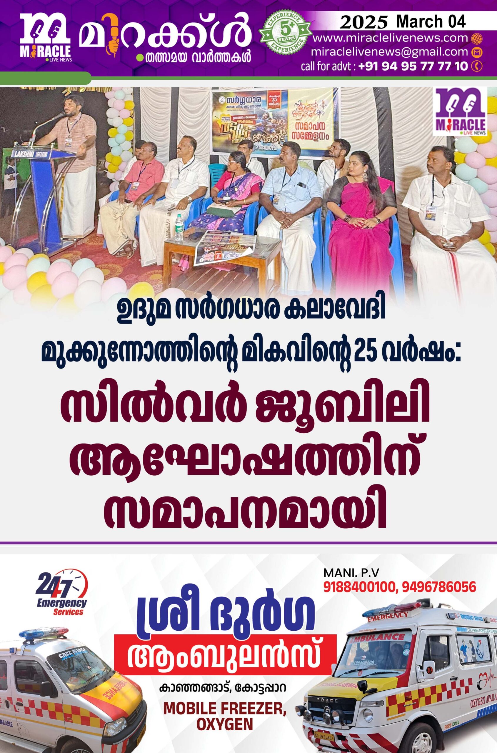 ഉദുമ: സര്ഗധാര കലാവേദി മുക്കുന്നോത്ത് ഉദുമ മികവിന്റെ 25 വര്ഷം സില്വര് ജൂബിലി ആഘോഷത്തിന്റെ ഭാഗമായി ഒരു വര്ഷക്കാലമായി നടന്നുവന്ന പരിപാടികളുടെ സമാപന സമ്മേളനവും ഉത്തര മേഖല സീനിയര് പുരുഷ വനിത വടംവലി മത്സരവും മുക്കുന്നോത്ത് പ്രത്യേകം സജ്ജമാക്കിയ സ്റ്റേഡിയത്തില് വെച്ച് സംഘടിപ്പിച്ചു. ജില്ലാ പഞ്ചായത്ത് വൈസ് പ്രസിഡണ്ട് ഷാനവാസ് പാദൂര് സമാപന സമ്മേളനം ഉദ്ഘാടനം ചെയ്തു. ഉദുമ ഗ്രാമപഞ്ചായത്ത് പ്രസിഡണ്ടും സംഘാടകസമിതി ചെയര്പേഴ്സനുമായ പി ലക്ഷ്മി അധ്യക്ഷത വഹിച്ചു. ഗീതാഗോവിന്ദം സീരിയല് താരം കുമാരി ആതിര ലക്ഷ്മണന് (ഹണി) മുഖ്യ അതിഥിയായി. ഉദുമ ഗ്രാമപഞ്ചായത്തംഗങ്ങളായ അശോകന് വി കെ, ചന്ദ്രന് നാലംവാതുക്കല്, വ്യാപാരി വ്യവസായ ഏകോപനസമിതി ജില്ലാ വൈസ് പ്രസിഡണ്ട് എ വി ഹരിഹരസുധന്, സര്ഗധാര കലാവേദി വൈസ് പ്രസിഡണ്ട് പുരുഷോത്തമന് പാത്തിക്കല്, ബാര മുക്കുന്നോത്ത് കാവ് ശ്രീ ഭഗവതി ക്ഷേത്ര പ്രസിഡണ്ട് കുഞ്ഞിക്കണ്ണന് നായര് പാലക്കാല് എന്നിവര് സംസാരിച്ചു. മുന് ജില്ലാ വിദ്യാഭ്യാസ ഓഫീസര് എന് നന്ദികേശന്, സില്വര് ജൂബിലി ആഘോഷ പരിപാടിയുടെ ലോഗോ രൂപകല്പന ചെയ്ത ശുചീന്ദ്രന് പരിയാരം, സംസ്ഥാന സ്കൂള് കായികമേളയില് സീനിയര് പെണ്കുട്ടികളുടെ 100 മീറ്റര് ഓട്ട മത്സരത്തില് സ്വര്ണമെഡല് കരസ്ഥമാക്കിയ വേഗറാണി രഹന രഘുവെടിക്കുന്ന്, റിട്ടയേഡ് സുബൈദാര് ഗിരീഷ് കുമാര് മുല്ലച്ചേരി, സംസ്ഥാന സ്കൂള് കായികമേളയില് പങ്കെടുത്ത നാടിന് അഭിമാനമായ ദിയാദാസ്, ശിഖ കെ വി, യോഗ പരിശീലകന് വി പ്രമോദ് എന്നിവരെയും ക്ലബ്ബിന്റെ മുന് പ്രസിഡണ്ടുമാരായ എം സുരേഷ് കുമാര്, എം ജയചന്ദ്രന്, എം കരുണാകരന്, കൃഷ്ണന് സി, രവീന്ദ്രന് ബി, അനീഷ് വി എം, രാജേഷ് എന് എന്നിവരെ ചടങ്ങില് വച്ച് ആദരിച്ചു. സംഘാടക സമിതി ജനറല് കണ്വീനര് അനീഷ് വി എം പ്രവര്ത്തന റിപ്പോര്ട്ട് അവതരിപ്പിച്ചു, ക്ലബ്ബ് പ്രസിഡണ്ട് എം കരുണാകരന് വിജയികള്ക്ക് ഉള്ള സമ്മാനങ്ങള് വിതരണം ചെയ്തു, സംഘാടകസമിതി വര്ക്കിംഗ് ചെയര്മാന് എം രാധാകൃഷ്ണന് മുക്കുന്നോത്ത് സ്വാഗതവും ക്ലബ്ബ് ജനറല് സെക്രട്ടറി ഉണ്ണികൃഷ്ണന് നന്ദിയും പറഞ്ഞു.