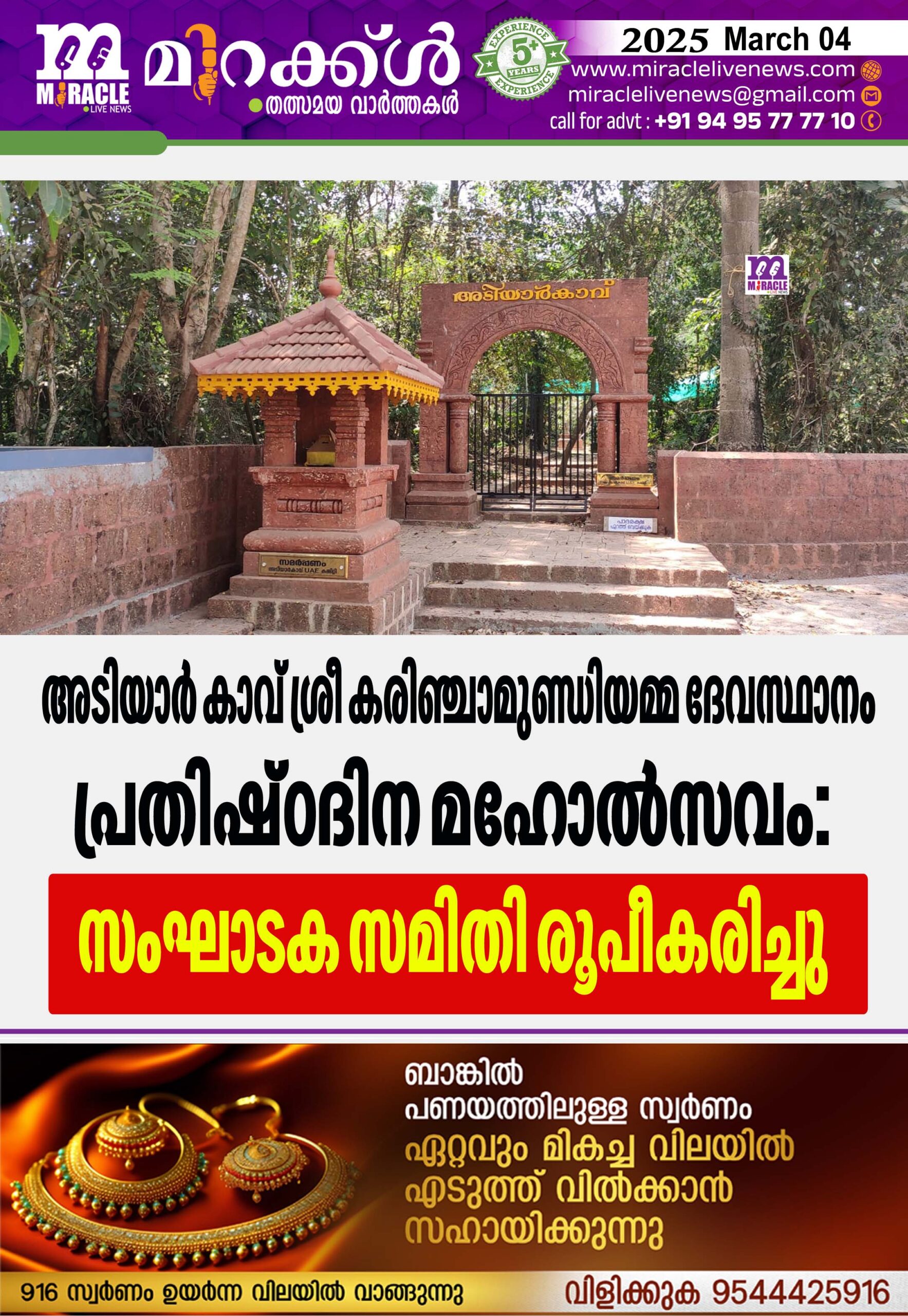 അടിയാര്‍ കാവ് ശ്രീ കരിഞ്ചാമുണ്ഡിയമ്മ ദേവസ്ഥാനം പ്രതിഷ്ഠദിന മഹോല്‍സവം: സംഘാടക സമിതി രൂപീകരിച്ചു.