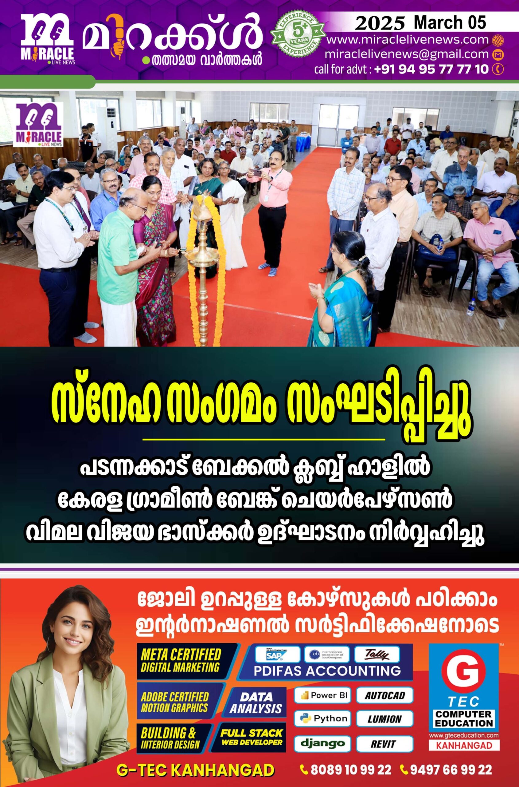 സ്നേഹ സംഗമം സംഘടിപ്പിച്ചു: പടന്നക്കാട് ബേക്കല് ക്ലബ്ബ് ഹാളില് കേരള ഗ്രാമീണ് ബേങ്ക് ചെയര്പേഴ്സണ് വിമല വിജയ ഭാസ്ക്കര് ഉദ്ഘാടനം നിര്വ്വഹിച്ചു