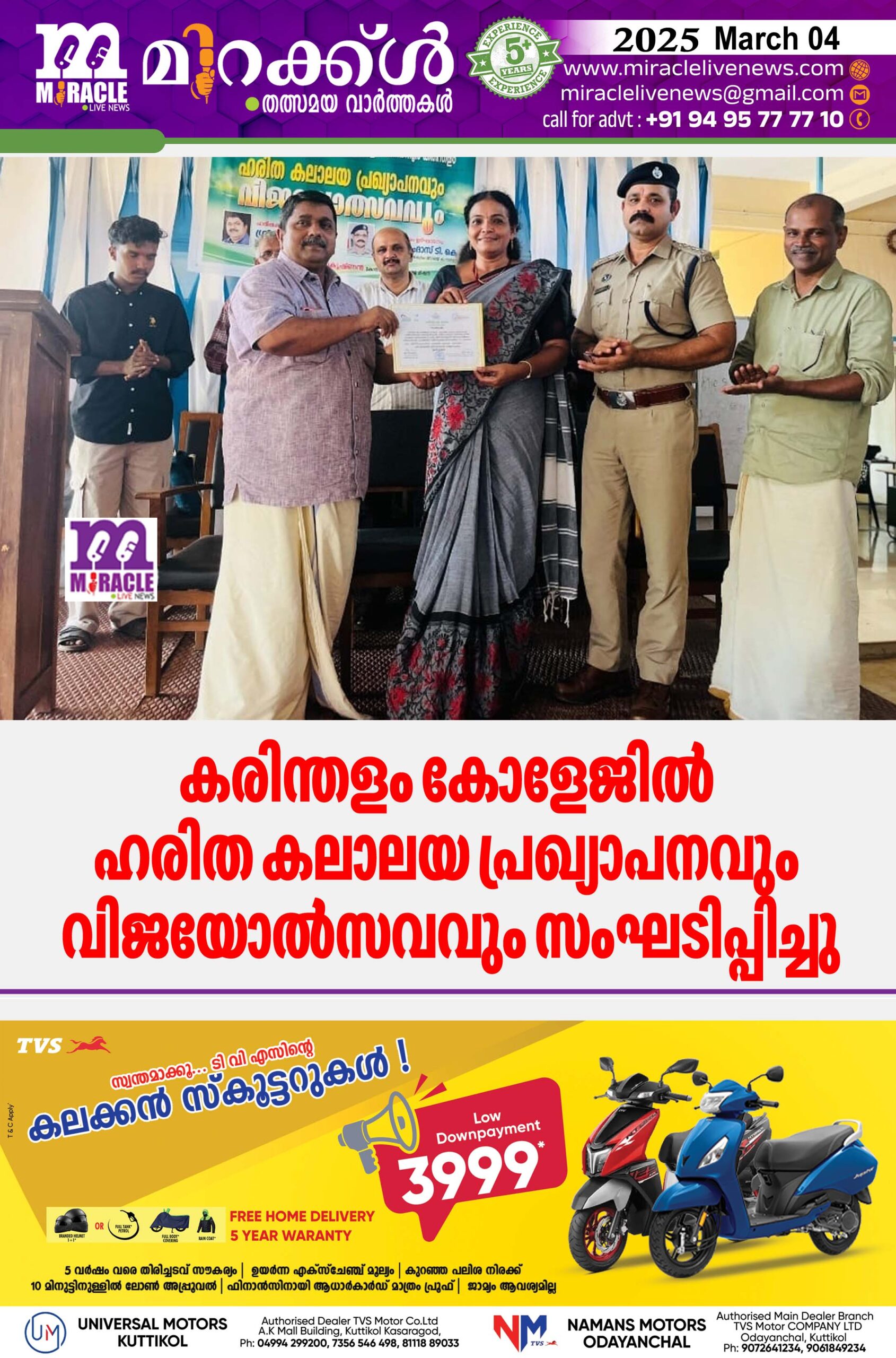 കരിന്തളം: കരിന്തളം ഗവ. ആര്‍ട്‌സ് ആന്റ് സയന്‍സ് കോളേജില്‍ ഹരിത കലാലയ പ്രഖ്യാപനവും വിജയോത്സവവും സംഘടിപ്പിച്ചു. കോളേജില്‍ നടന്ന പരിപാടിയില്‍ കിനാനൂര്‍ കരിന്തളം ഗ്രാമപഞ്ചായത്ത് പ്രസിഡണ്ട് ടി.കെ രവി ഹരിത കലാലയ പ്രഖ്യാപനം നടത്തി . കണ്ണൂര്‍ യൂണിവേഴ്‌സിറ്റി സി സോണ്‍ ക്രിക്കറ്റ് ടൂര്‍ണമെന്റില്‍ റണ്ണര്‍ അപ്പായ കോളേജ് ടീമിംഗങ്ങളെ ഡിസ്ട്രിക്റ്റ് ക്രൈം ബ്രാഞ്ച് ഡിവൈഎസ്പി ഉത്തംദാസ് ഉപഹാരങ്ങള്‍ നല്‍കി അനുമോദിച്ചു . വിദ്യാര്‍ഥികള്‍ക് ലഹരി വിരുദ്ധ ബോധവല്‍ക്കരണവും അദ്ദേഹം നല്‍കി .പ്രിന്‍സിപ്പാള്‍ കെ.വിദ്യ അധ്യക്ഷത വഹിച്ചു. പഞ്ചായത്ത് ആരോഗ്യ വിദ്യാഭ്യാസ സ്റ്റാന്റിംഗ് കമ്മറ്റി ചെയര്‍മാന്‍ കെ വി അജിത് കുമാര്‍, ഹരിത കേരളം റിസോഴ്‌സ് പേഴ്‌സന്‍ രാഘവന്‍ മാസ്റ്റര്‍, ജയ്‌സന്‍ വി ജോസഫ്, എസ്. ആര്‍ ശ്രീദേവി, സ്‌പോര്‍ട്‌സ് ക്യാപ്റ്റന്‍ സിദ്ധാര്‍ത്ഥ്, കോളേജ് സൂപ്രണ്ട് ഷൈജ സി.വി ,പി ടി എ വൈസ് പ്രസിഡണ്ട് വി. മധുസൂദനന്‍ എന്നിവര്‍സംസാരിച്ചു.