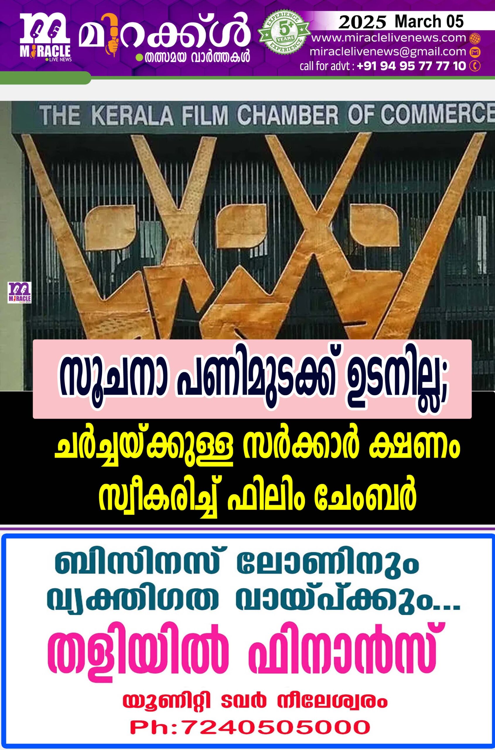 കൊച്ചി: സിനിമാ മേഖലയിലെ പ്രശ്നങ്ങളുമായി ബന്ധപ്പെട്ട് ചര്ച്ചയ്ക്കുള്ള സര്ക്കാരിന്റെ ക്ഷണം സ്വീകരിച്ച് ഫിലിം ചേംബര്.