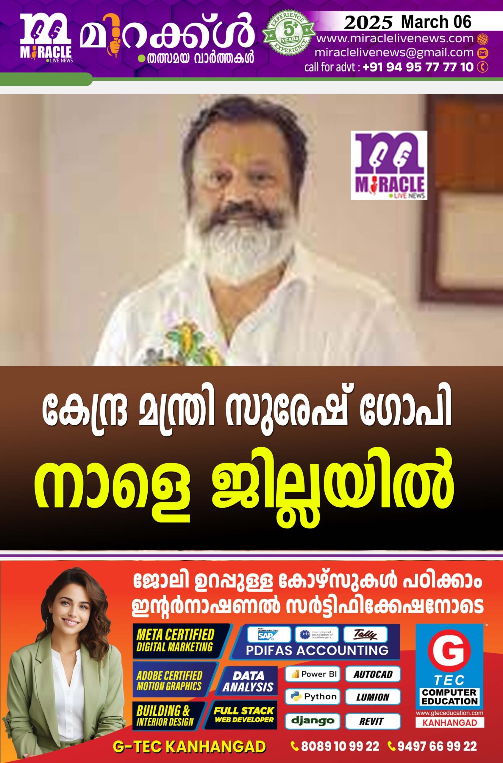കേന്ദ്ര മന്ത്രി സുരേഷ് ഗോപി നാളെ ജില്ലയില്‍