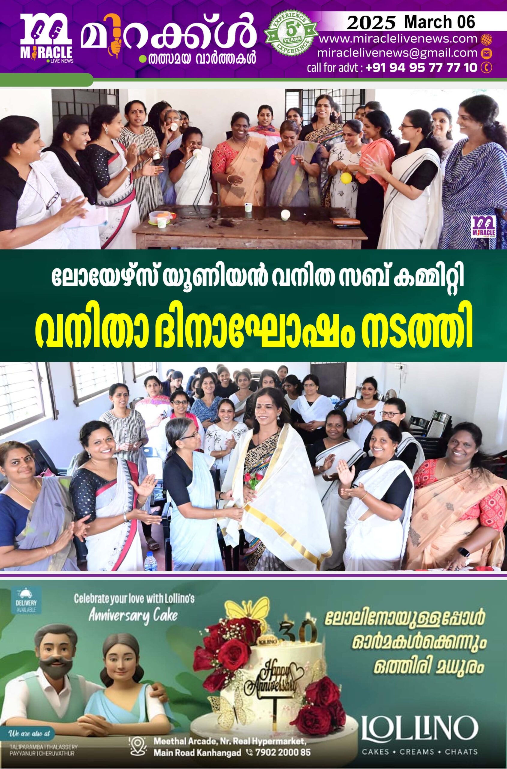 കാഞ്ഞങ്ങാട്: മാര്‍ച്ച് 8 ലോക വനിതാദിനത്തിന്റെ ഭാഗമായി ലോയേഴ്‌സ് യൂണിയന്‍ ഹൊസ്ദുര്‍ഗ് വനിതാ സബ് കമ്മിറ്റി വനിതാദിനാഘോഷം നടത്തി. ആഘോഷത്തിന്റെ ഭാഗമായി വിവിധ കലാകായിക മത്സരങ്ങള്‍, സംവാദം എന്നിവ നടത്തി. ആദ്യമായി സിനിമയില്‍ പാടിയ ട്രാന്‍സ് ജെന്റര്‍ വുമണ്‍ നര്‍ത്തകിയമായ ചാരുലത ചടങ്ങ്  ഉദ്ഘാടനം ചെയ്തു. തുടര്‍ന്ന് ട്രാന്‍സന്റ് മേഖലയിലെ പ്രശ്‌നങ്ങള്‍, പൊതുസമൂഹവുമായി ഉള്ള ബന്ധം, ഗുണങ്ങളും ,ദോഷങ്ങളും, ഈ മേഖലയില്‍ എത്തിയതിന്റെ അനുഭവങ്ങള്‍ തുടങ്ങിയ നിരവധി കാര്യങ്ങള്‍ വനിത അഭിഭാഷകരുമായി സംവാദം നടത്തി. വനിതാ സബ് കമ്മിറ്റി ചെയര്‍മാന്‍ ടിട്ടിമോള്‍ കെ ജൂലി അധ്യക്ഷത വഹിച്ചു. അഭിഭാഷകരായ പി ബിന്ദു, പി സിന്ധു, രേണുക ദേവി തങ്കച്ചി, എന്‍ പി സീമ എന്നിവര്‍ സംസാരിച്ചു. വനിത സബ്കമ്മിറ്റി കണ്‍വീനര്‍ കെ വി സൗഭാഗ്യ സ്വാഗതവും പി രജിത നന്ദിയും പറഞ്ഞു.