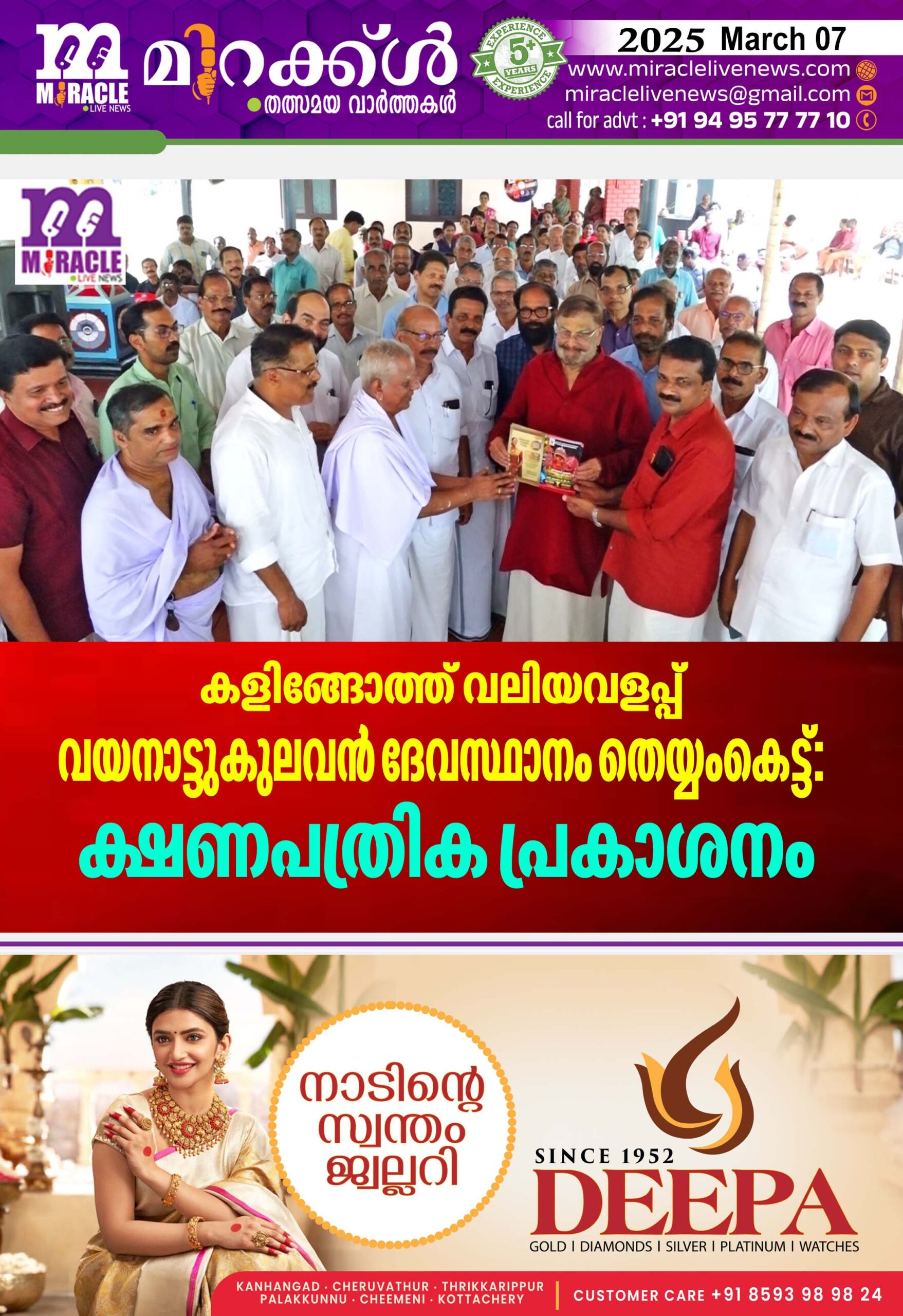 പാലക്കുന്ന് : കഴകം ഭഗവതി ക്ഷേത്രം കളിങ്ങോത്ത് പ്രാദേശിക സമിതിയില് പെടുന്ന പനയാല് കളിങ്ങോത്ത് വലിയവളപ്പ് വയനാട്ട് കുലവന് ദേവസ്ഥാനത്ത് ഏപ്രില് 15,16,17 തീയതികളില് നടക്കുന്ന തെയ്യംകെട്ട് മഹോത്സവത്തിന്റെ ക്ഷണപത്രിക റിട്ടയേര്ഡ് പോലീസ് സൂപ്രണ്ട് ബാലകൃഷ്ണന് നായർ പ്രകാശനം ചെയ്തു. പാലക്കുന്ന് ക്ഷേത്ര സമിതി പ്രസിഡണ്ട് അഡ്വ. കെ ബാലകൃഷ്ണന്, ക്ഷേത്രസ്ഥാനികന് കപ്പണക്കാല് കുഞ്ഞിക്കണ്ണന് ആയത്താര് എന്നിവര് ക്ഷണപത്രിക ഏറ്റുവാങ്ങി. പള്ളിക്കര പഞ്ചായത്ത് പ്രസിഡണ്ട് എം. കുമാരന് യോഗം ഉദ്ഘാടനം ചെയ്തു. ചടങ്ങില് മഹോത്സവകമ്മിറ്റി ചെയര്മാന് അഡ്വ. വിജയന് നമ്പ്യാര് അധ്യക്ഷത വഹിച്ചു. വര്ക്കിംഗ് ചെയര്മാന് പി. കെ രാജേന്ദ്രനാഥ്, ക്ഷേത്രസ്ഥാനികന് രവീന്ദ്രന് കളക്കാരന്, എ. രാമചന്ദ്രന് നായര് പെരിയ, കൃഷ്ണന് ചട്ടഞ്ചാല്, മേലത്ത് ബാലകൃഷ്ണന് നായര്, ഉദയമംഗലം സുകുമാരന്, പി. വി. ചിത്രഭാനു, ചന്തന്കുഞ്ഞി പനയാല്, സി. നാരായണൻ, ജിതിൻ ചന്ദ്രൻ വെളുത്തോളി, എന്നിവര് സംസാരിച്ചു. 26ന് കൂവം അളക്കും.