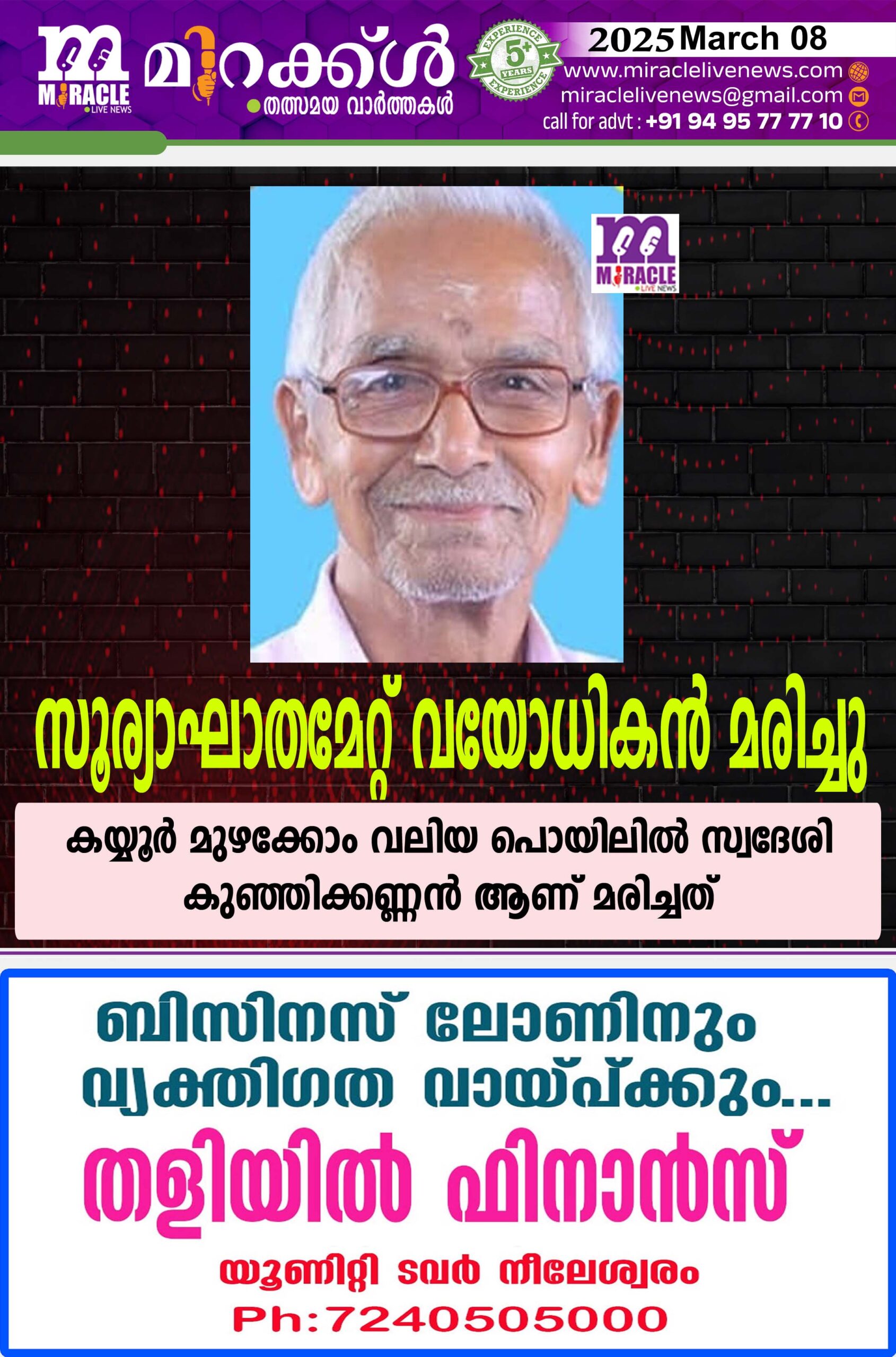ചെറുവത്തൂര് : സൂര്യാഘാതമേറ്റ് വയോധികന് മരിച്ചു. കയ്യൂര് മുഴക്കോം വലിയ പൊയിലില് സ്വദേശി കുഞ്ഞിക്കണ്ണന് (92) ആണ് മരിച്ചത്. ശനിയാഴ്ച ഉച്ചയ്ക്ക് രണ്ടരയോടെ വീടിന് സമീപത്തുവച്ചാണ് സൂര്യാഘാതമേറ്റത്. നെഞ്ച് ഭാഗത്ത് പൊള്ളലേറ്റ ഇദ്ദേഹത്തെ ഉടന്തന്നെ ചെറുവത്തൂരിലെ സ്വകാര്യ ആശുപത്രിയിലെത്തിച്ചെങ്കിലും മരിച്ചതായി സ്ഥിരീകരിച്ചു. എന്നാല് കണ്ണൂര് മെഡിക്കല് കോളേജിലെ വിദഗ്ധ പോസ്റ്റുമോര്ട്ടത്തിന് ശേഷം മാത്രമേ അന്തിമമായ സ്ഥിരീകരിക്കാനാകൂവെന്ന് ജില്ലാ മെഡിക്കല് ഓഫീസര് അറിയിച്ചു. ചീമേനി പോലീസെത്തി ഇന്ക്വസ്റ്റ് നടത്തി മൃതദേഹം പരിയാരം കണ്ണൂര് ഗവ. മെഡിക്കല് കോളേജിലേക്ക് മാറ്റി.