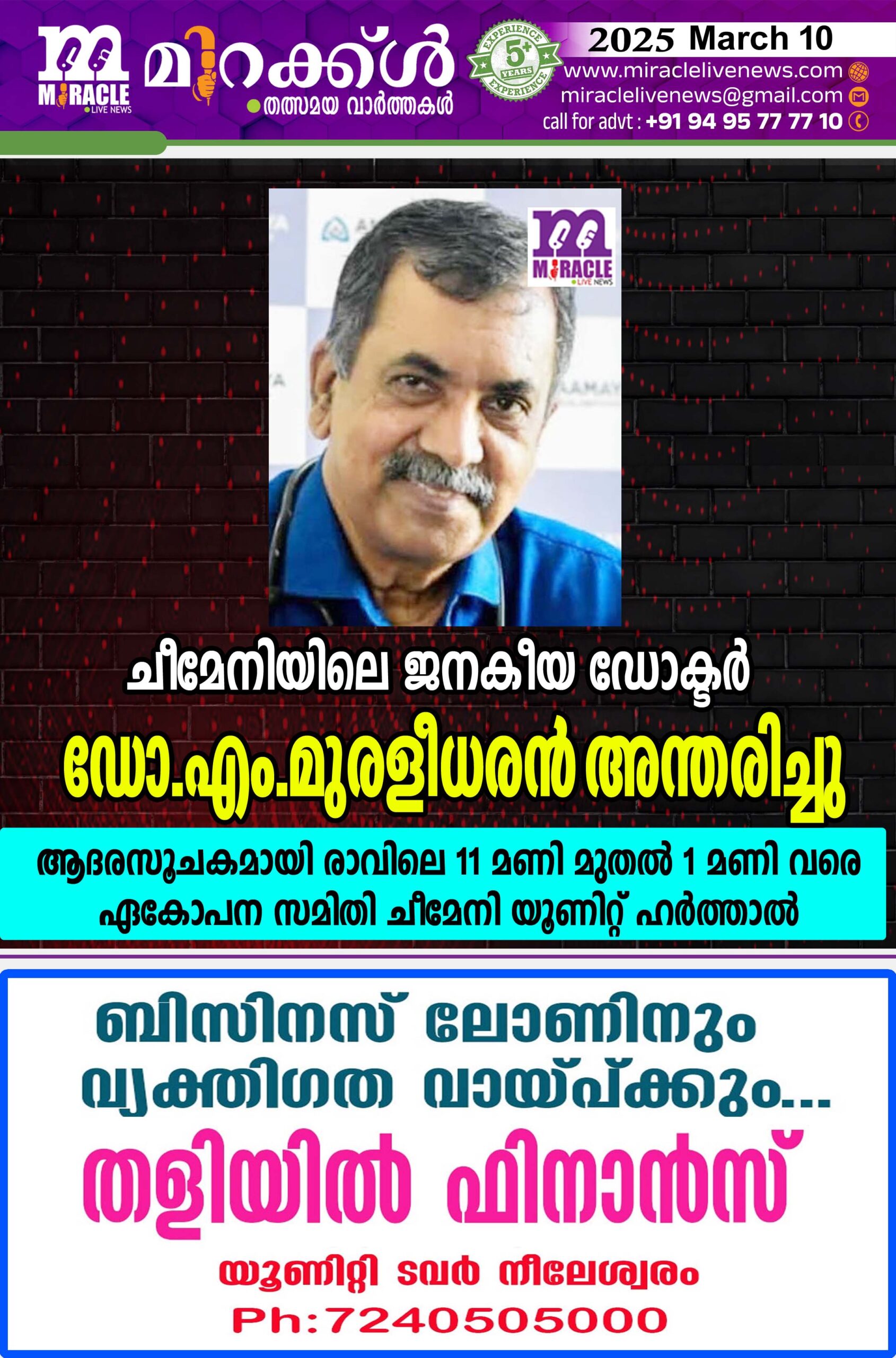 ചീമേനിയിലെ ജനകീയ ഡോക്ടര് ഡോ.എം.മുരളീധരന് അന്തരിച്ചു; ആദരസൂചകമായി രാവിലെ 11 മണി മുതല് 1 മണി വരെ ഏകോപന സമിതി ചീമേനി യൂണിറ്റ് ഹര്ത്താല്